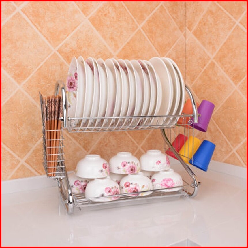 Rak Piring Stainless Rak Peralatan Dapur 2 Tingkat Rak Pengering Piring Gelas Mangkok