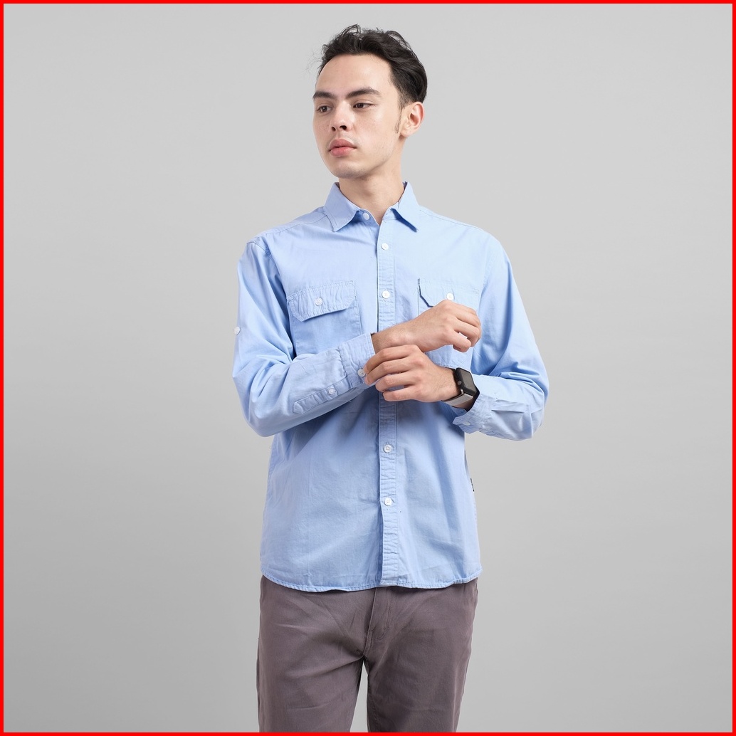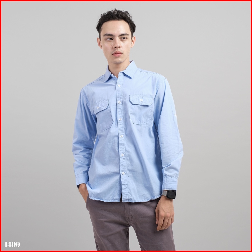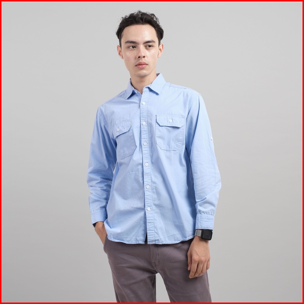 Dgm Kemeja Pria Lengan Panjang Polos Kemeja Polos Tactical Baby Canvas Blue Double Pocket 1499