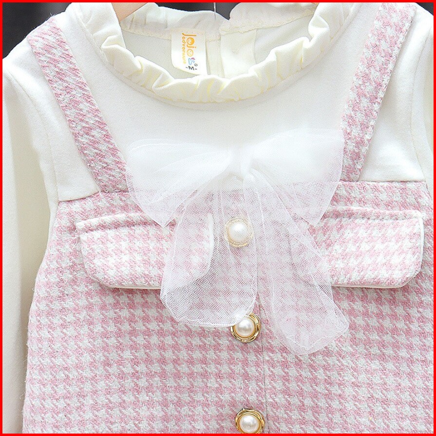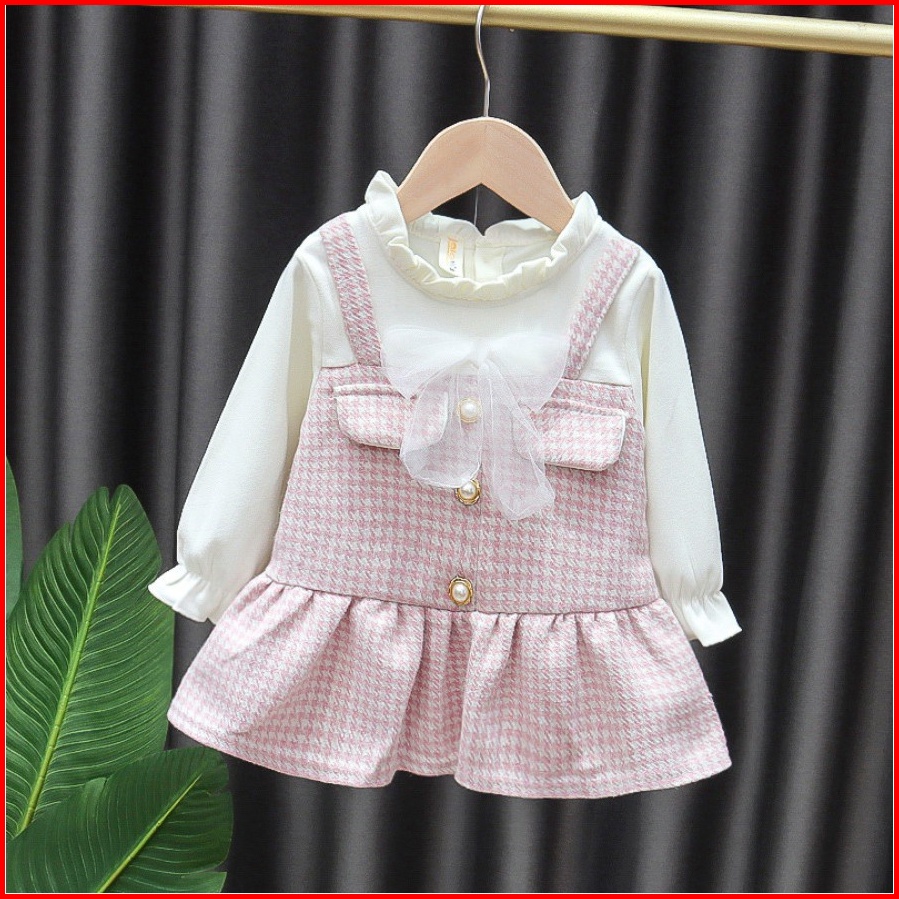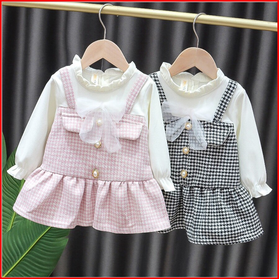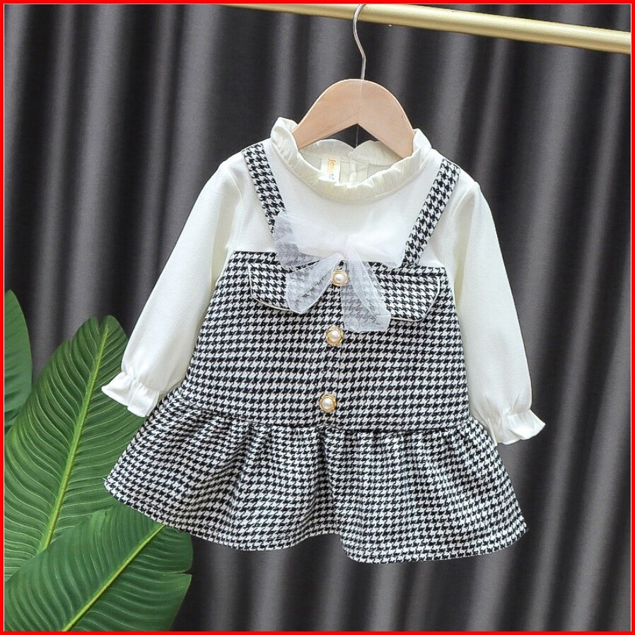 D91- Dress Bayi Dress Anak Pakaian Bayi Anak Perempuan Tebal Motif Kotak Kancing Mutiara Premium