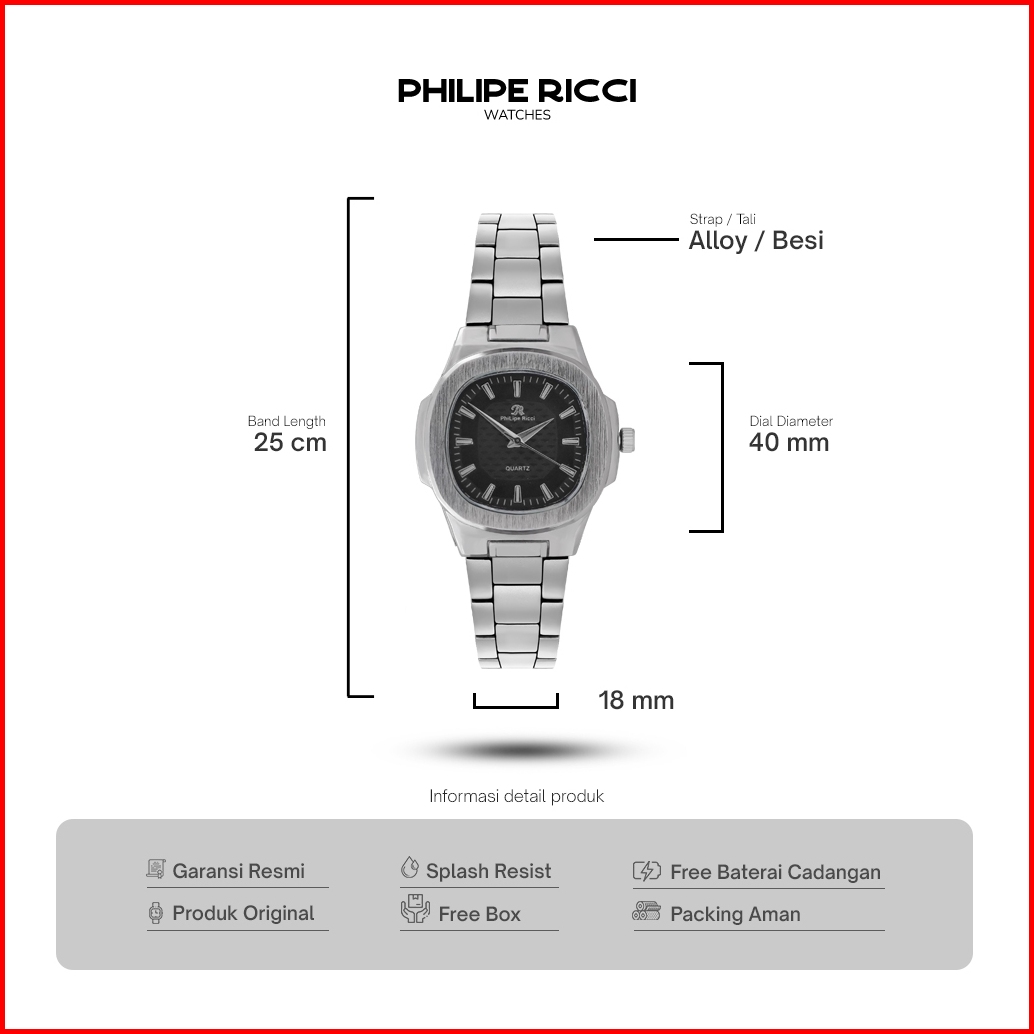 Philipe Ricci Jam Tangan Wanita Analog Strap Tali Rantai Dial Kotak Model Simpel Kasual 5038b Free Box