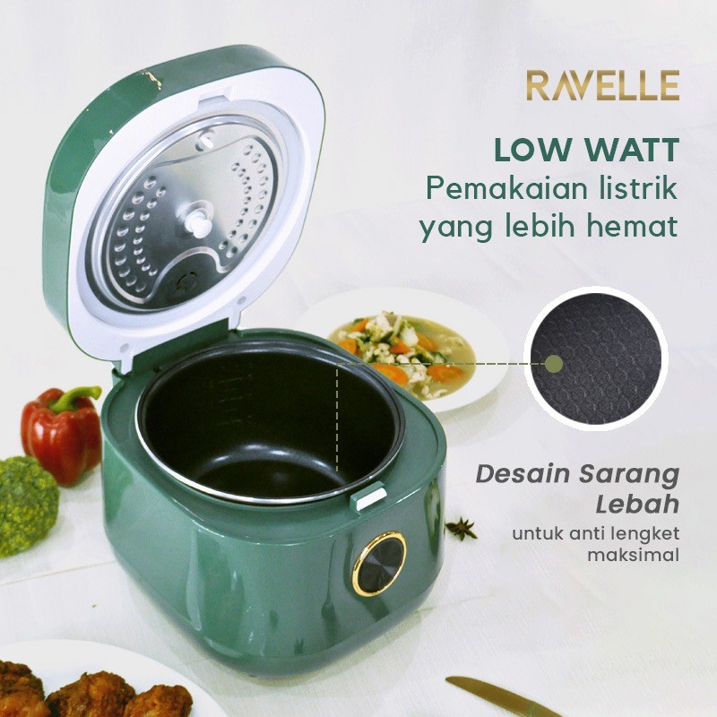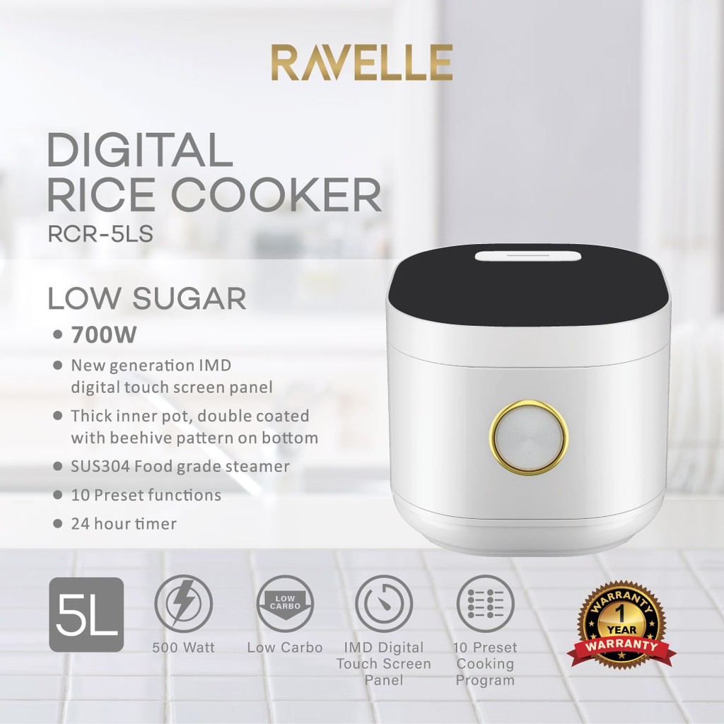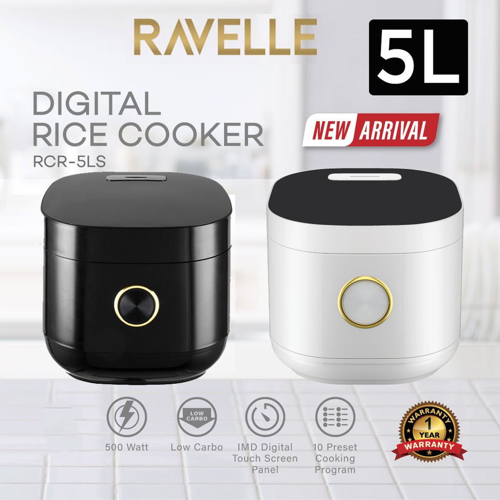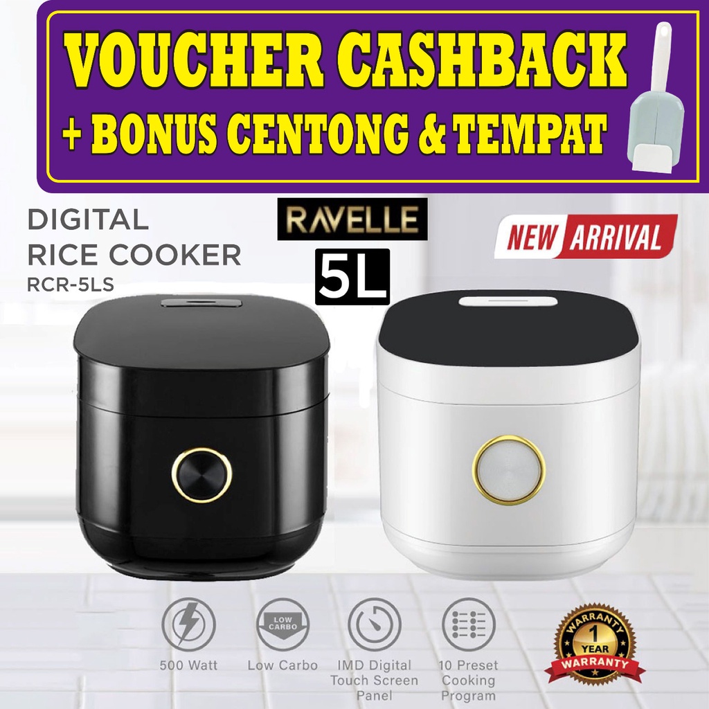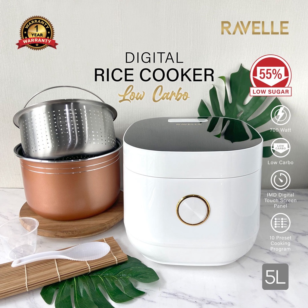 FREE ONGKIR [BONUS CENTONG + TEMPAT] Ravelle Digital Low Carbo Rice Cooker 5L 5 L 5 LITER Onyx Black / Pearl White hitam