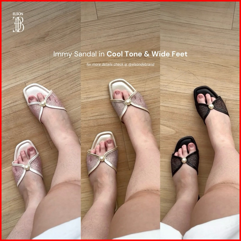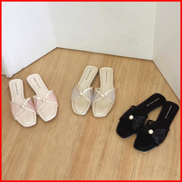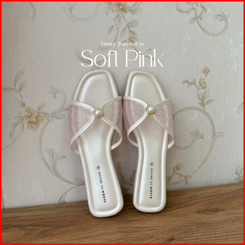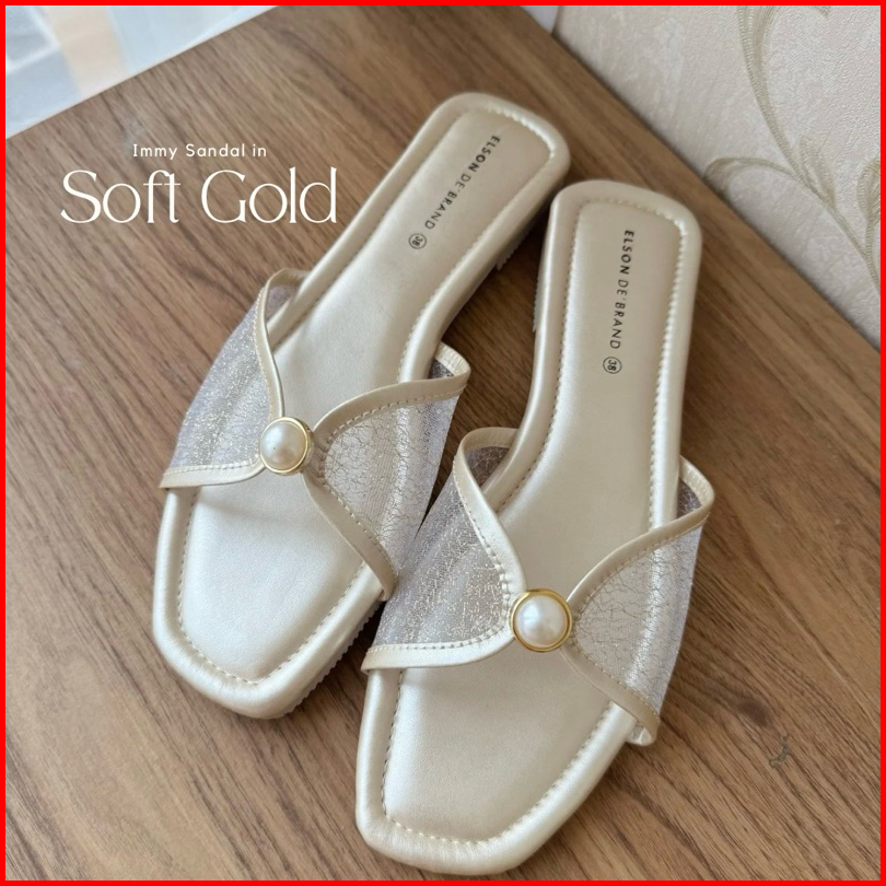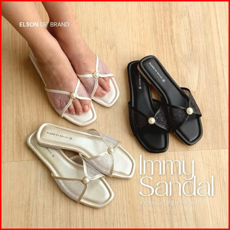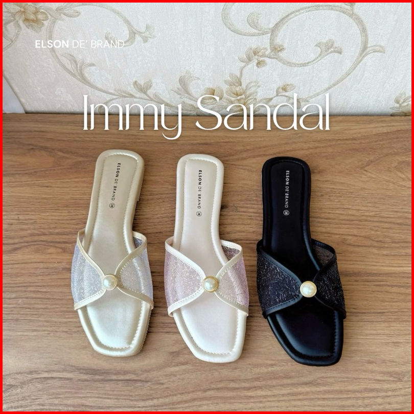 Elson Immy Sandal Flat Wanita Elegan Viral Mutiara Jaring Premium Empuk Anti Slip