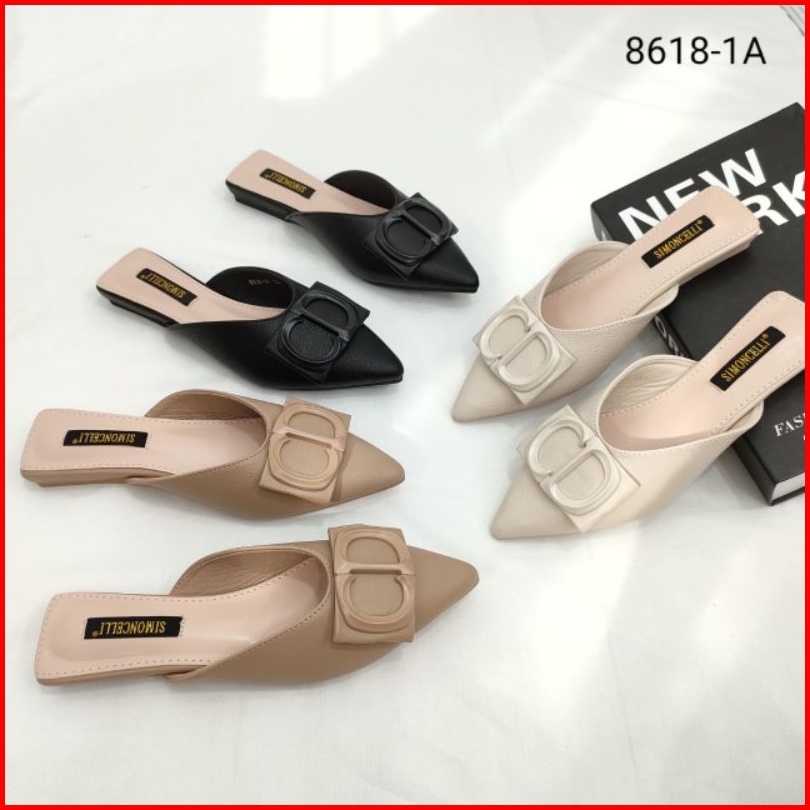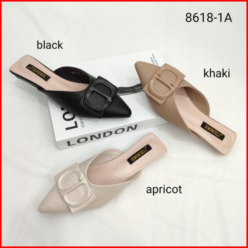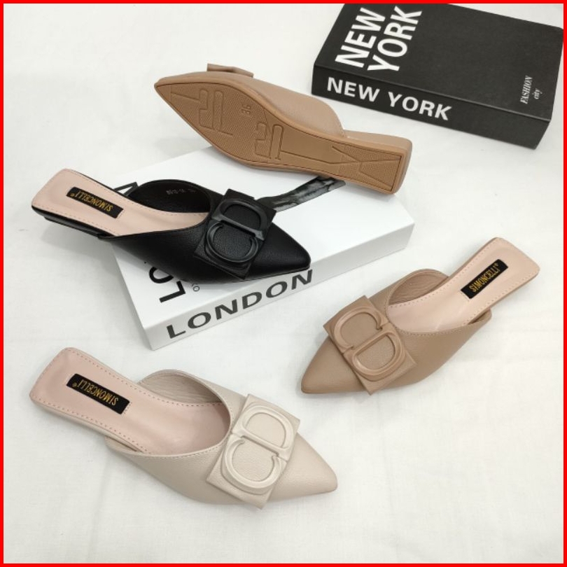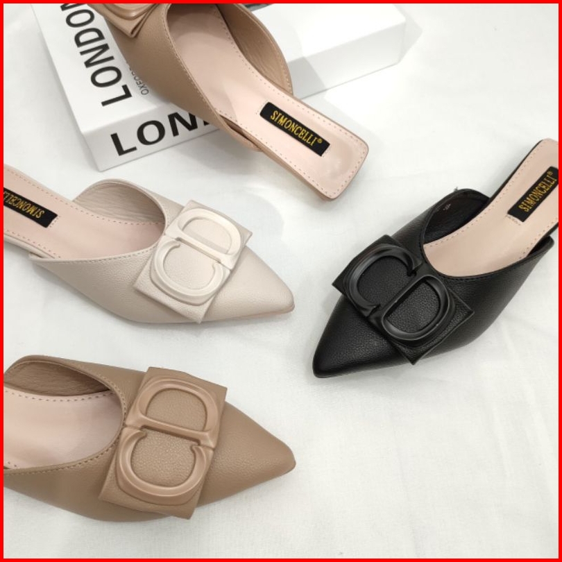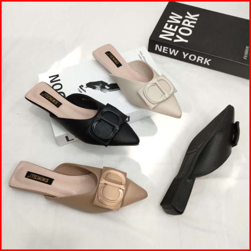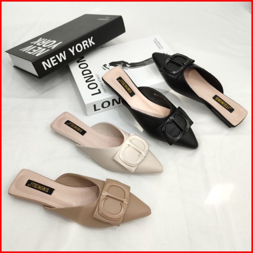 Simoncelli Sandal Wanita Flat Runcing Mutiara Polos Sandal Kerja Hitam Black Khaki Apricot Cewek Acara Pesta Kondangan E