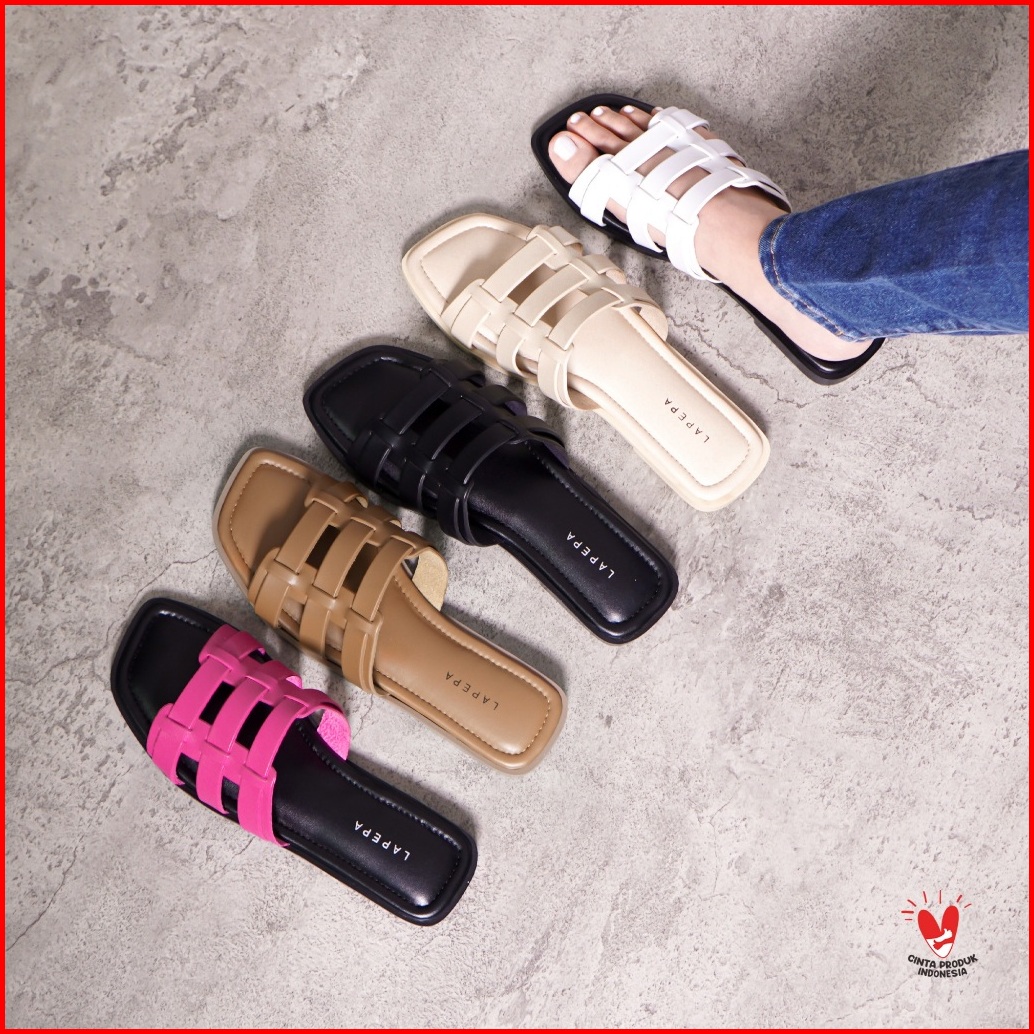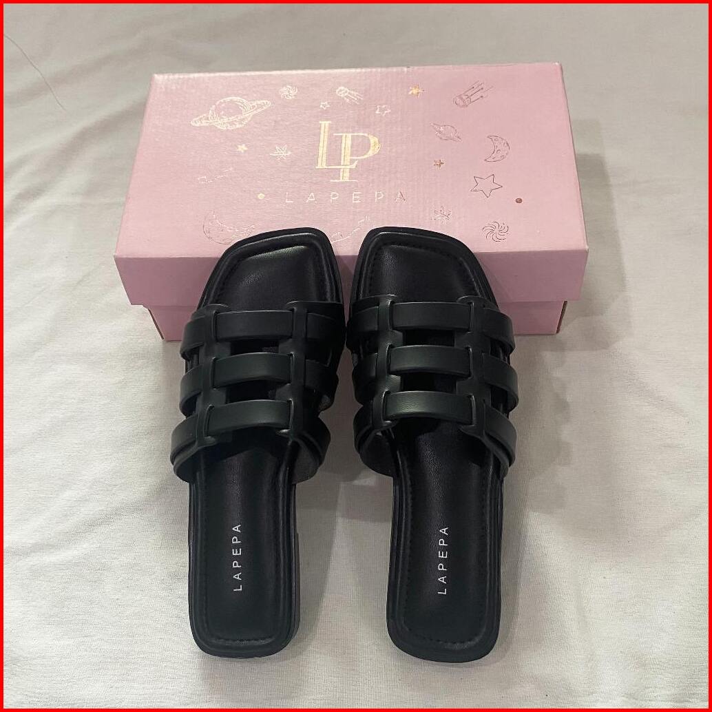 Lapepa Store - Tessa Black Sandal Flat Wanita Sandal Teplek Cewek Terbaru Sendal Slop Perempuan Karet Kekinian Warna Hit