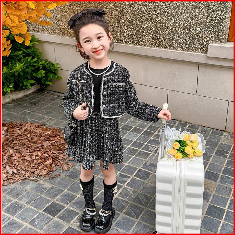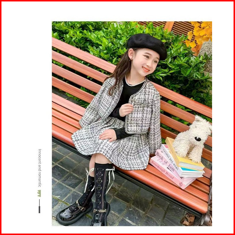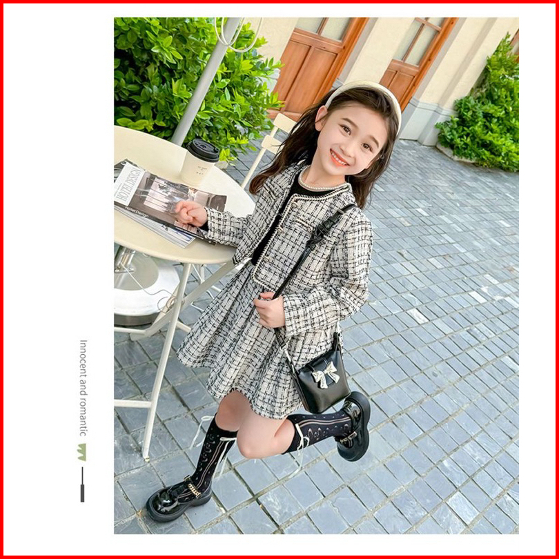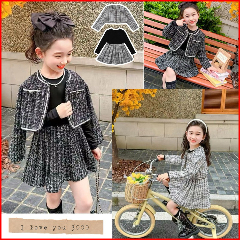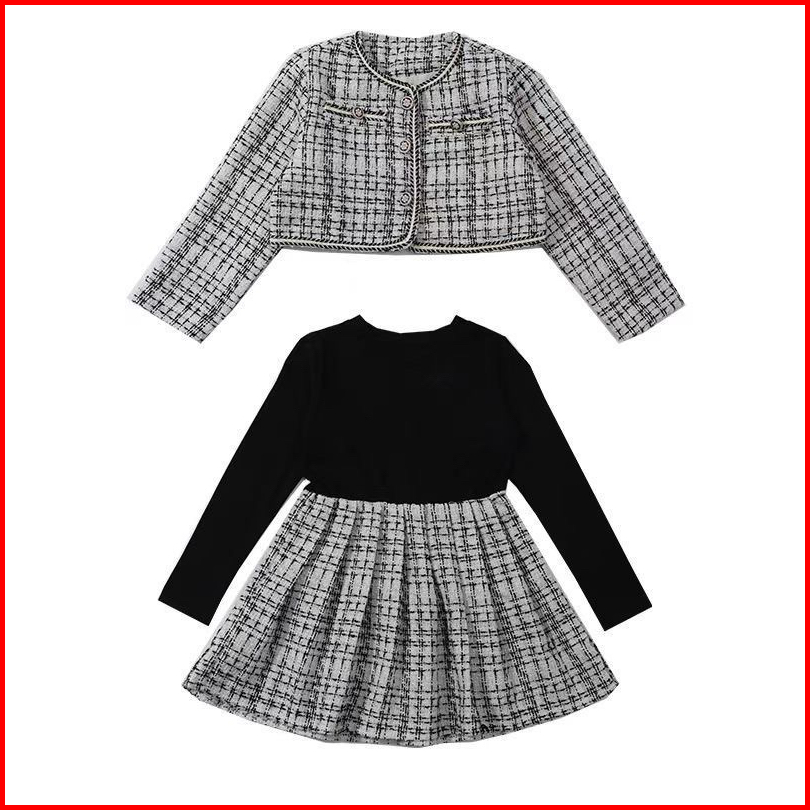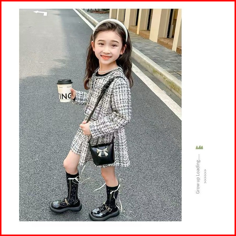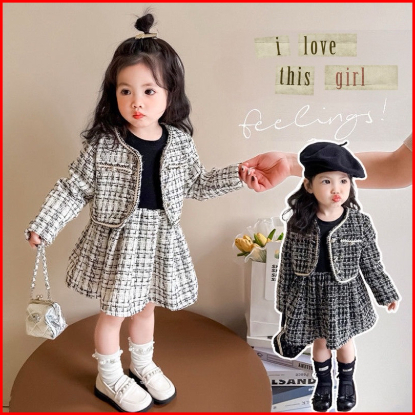 1-8tahun Dress Blazer 2in1 Tweed Hitam Putih Gaun Baju Anak Perempuan Korea Ootd