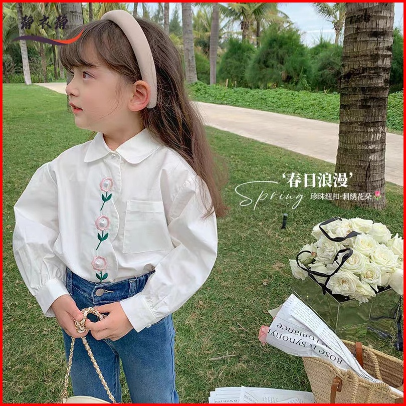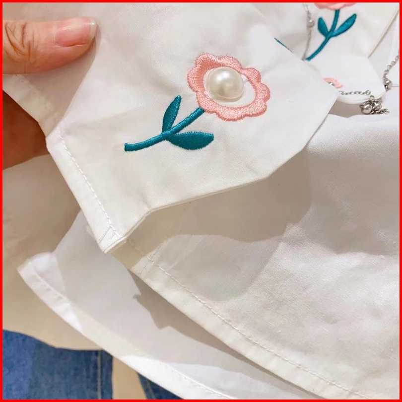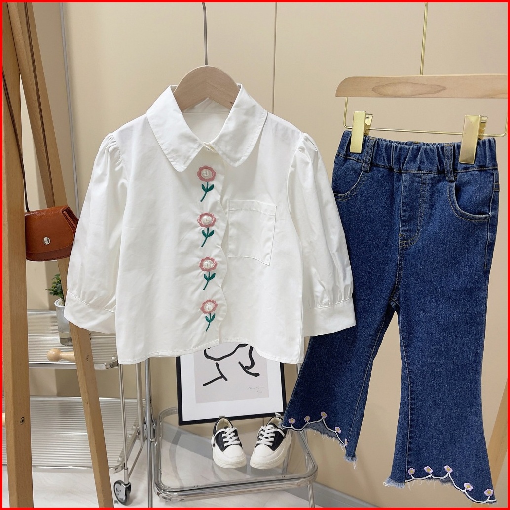Kd102 Setelan Set Anak Besar Teenager Remaja Perempuan Kemeja Bunga Kancing Celana Panjang Jeans