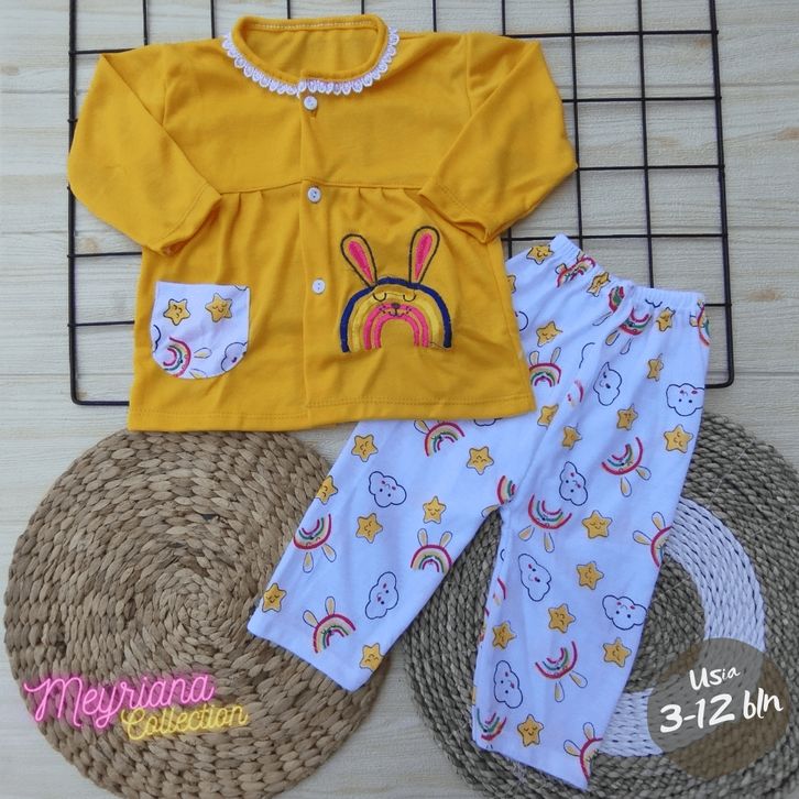 Setelan Baju Anak Baju Celana Setelan Piyama Bayi Perempuan Kancing Depan Usia 3-12 Bulan Motif Rainbow Best Seller