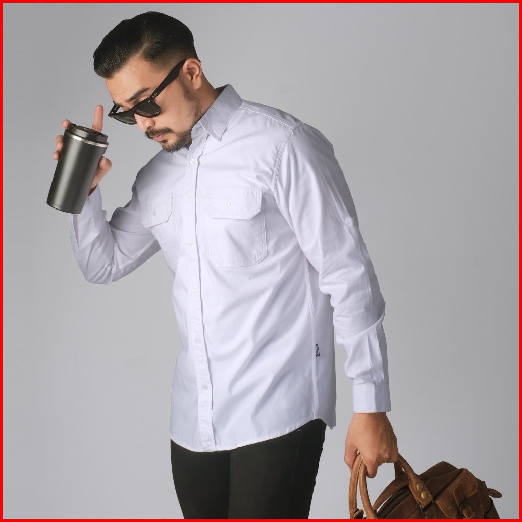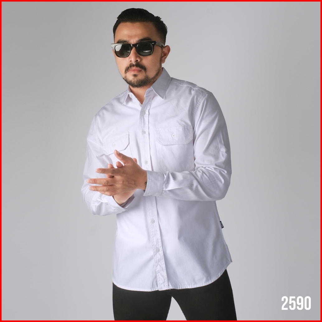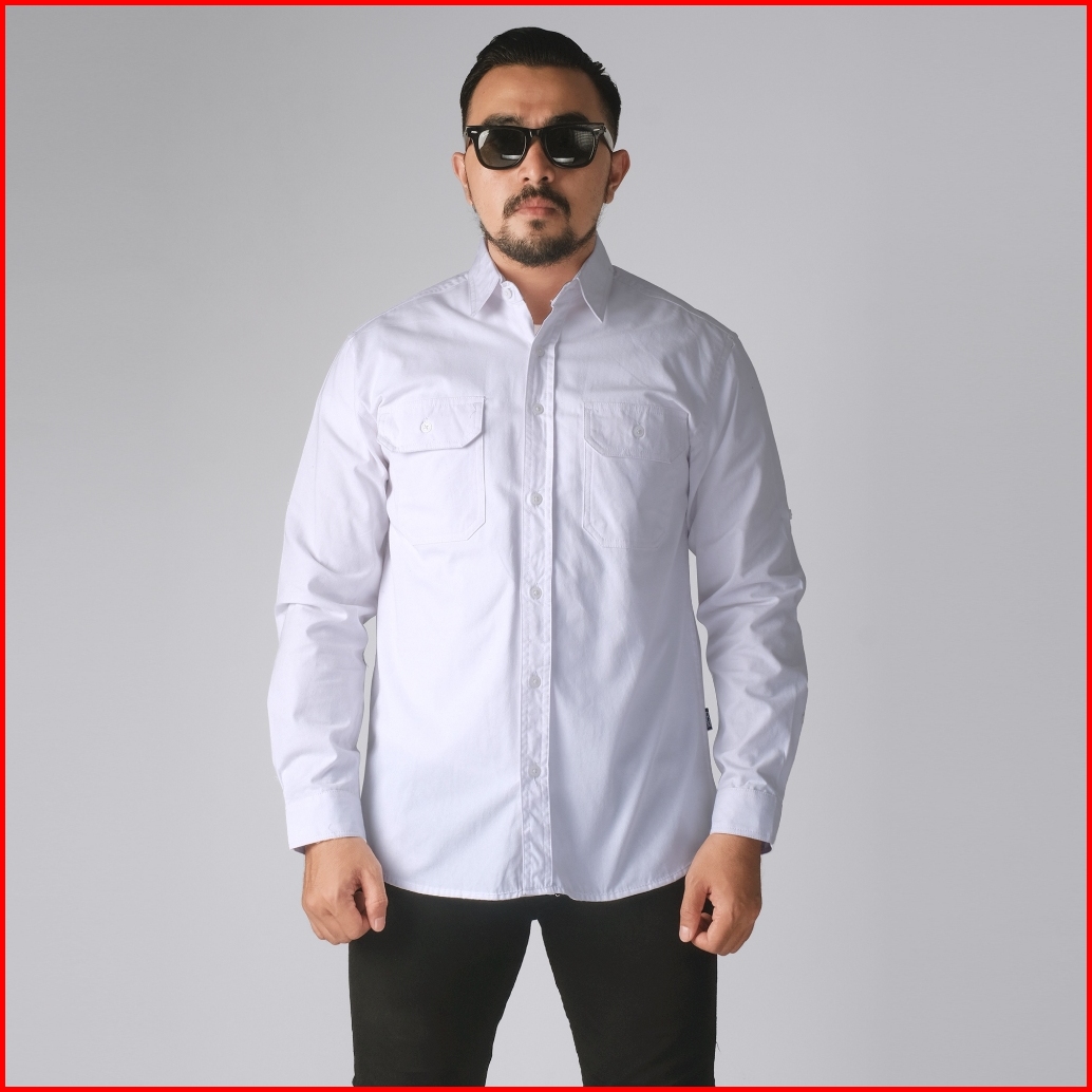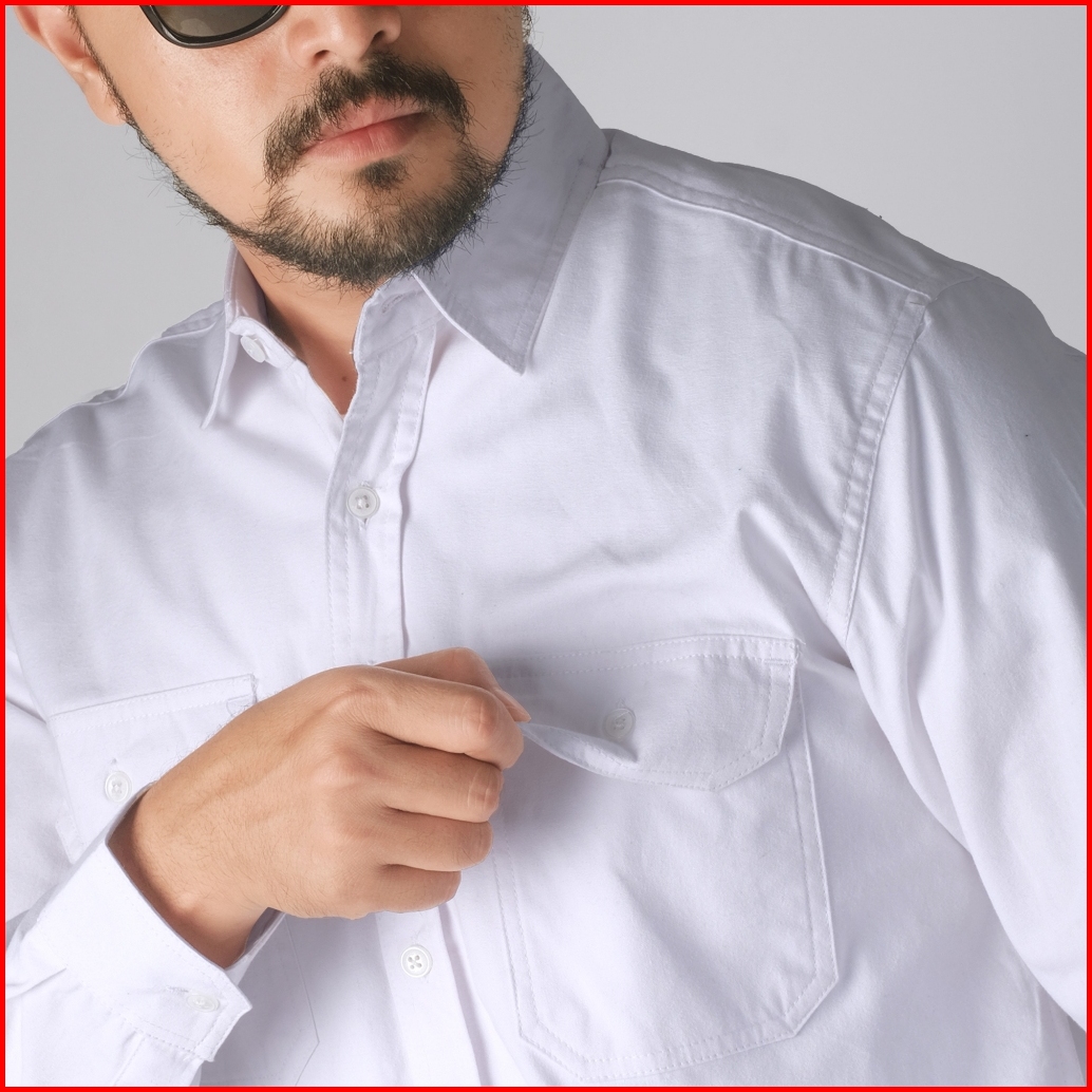 Dgm Kemeja Pria Polos Double Pocket Lengan Panjang Putih Workshirt Kemeja Kerja 2590