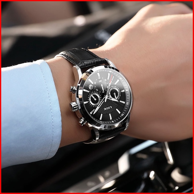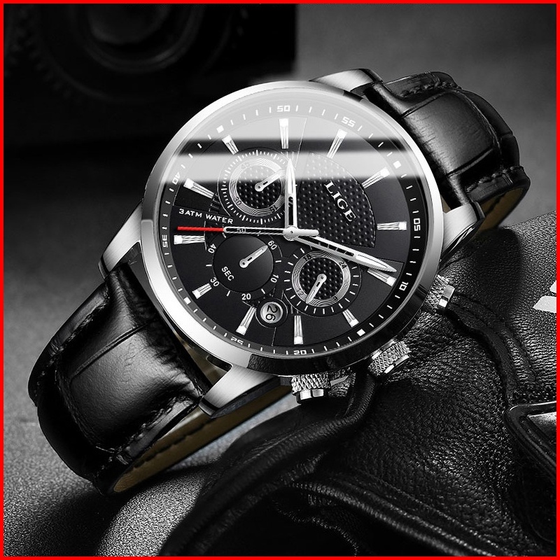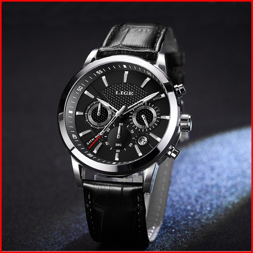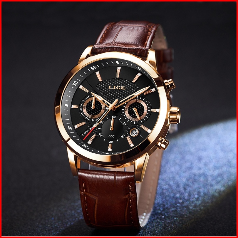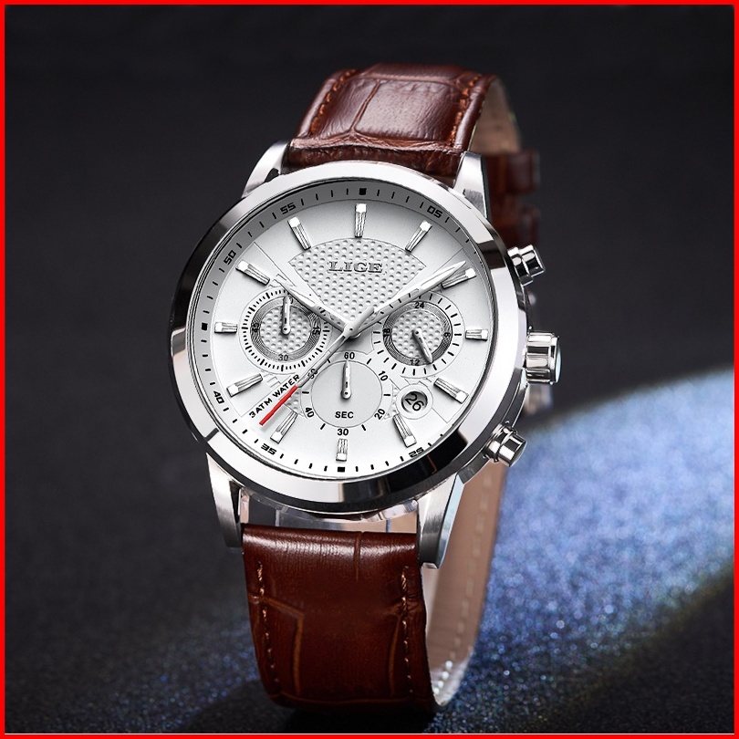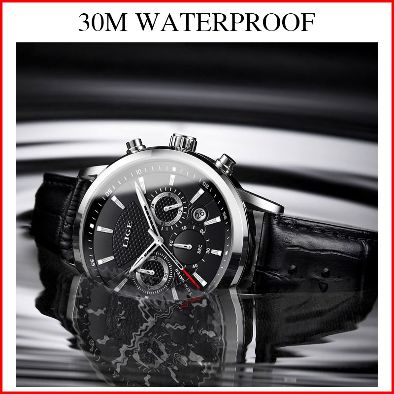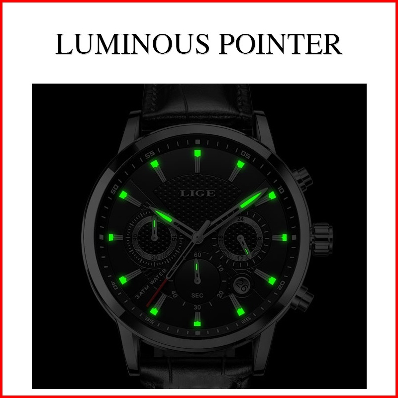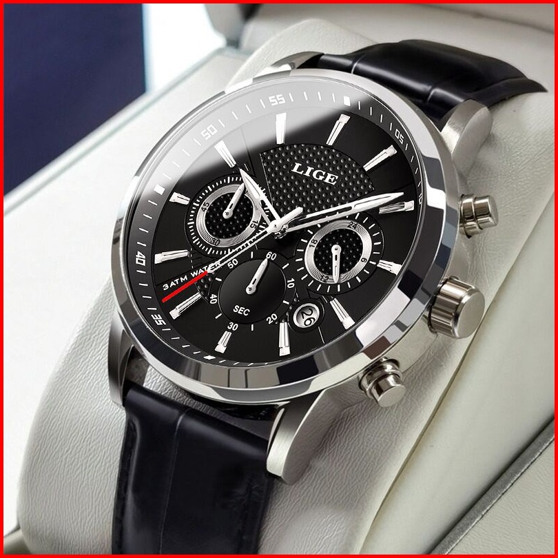 Lige Fashion Tali Kulit Jam Tangan Pria Original Anti Air Sports Kronograf Fungsi Jam Tangan Kotak