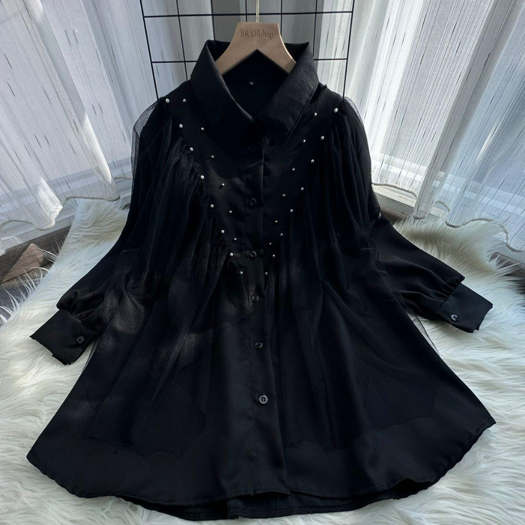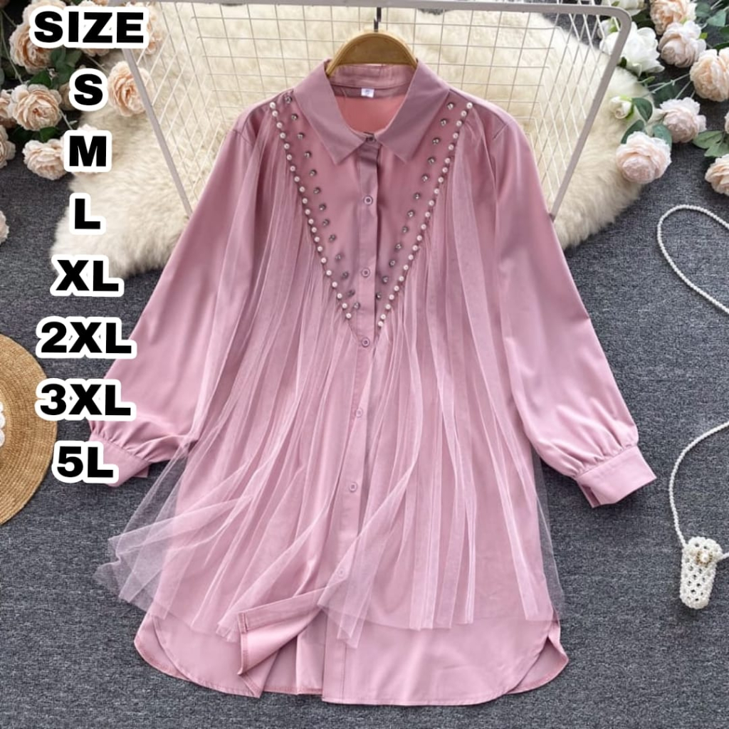 Risa Kemeja wanita mix tile aplikasi mutiara Jumbo tunik BIG SIZE Tunik Over size S M L XL XXL 3XL 5 L Atasan Kancing