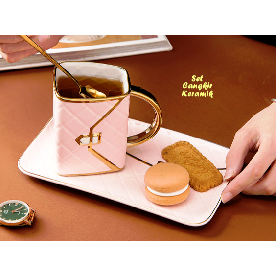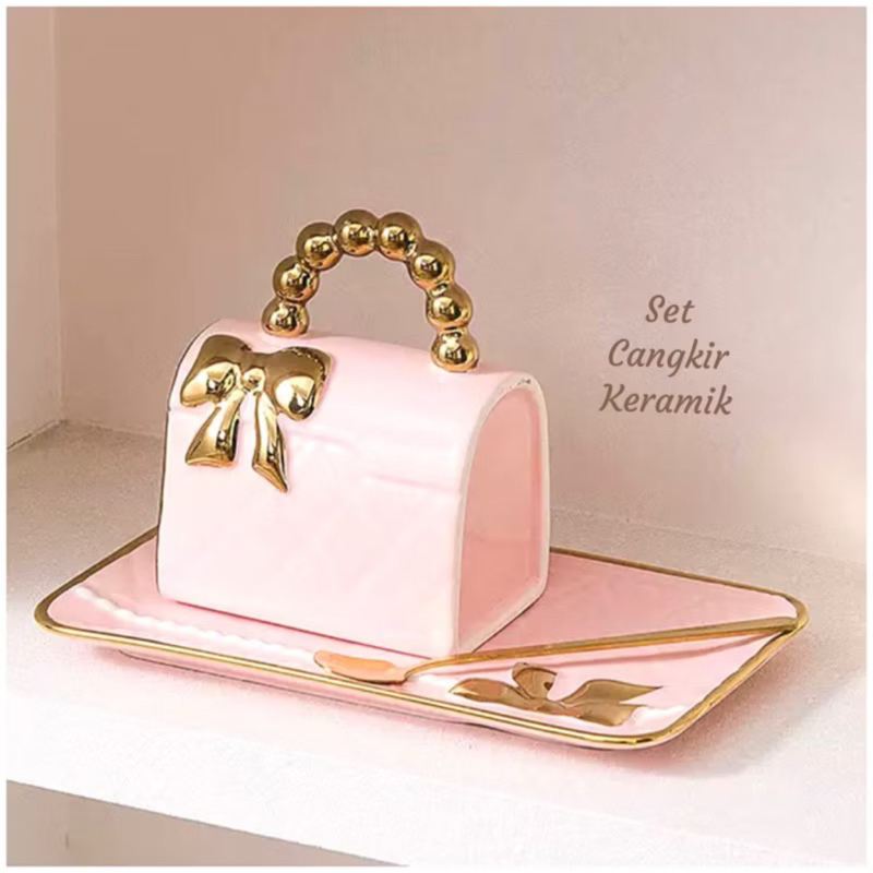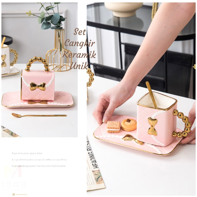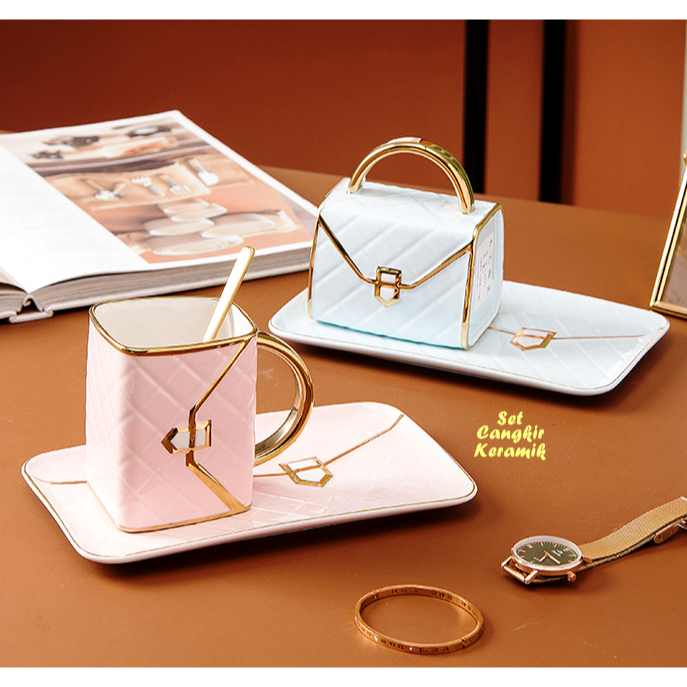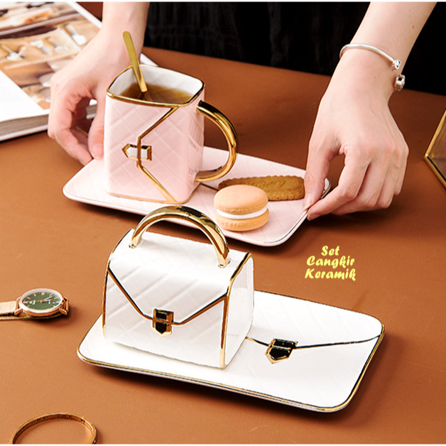SET Cangkir TAS ( isi cangkir + piring + sendok ) Elegant Cup Set Creative Bag Coffee Cup Set Cangkir Unik Perlengkapan