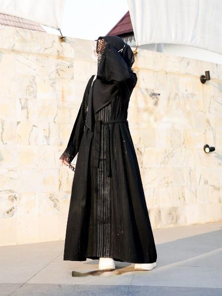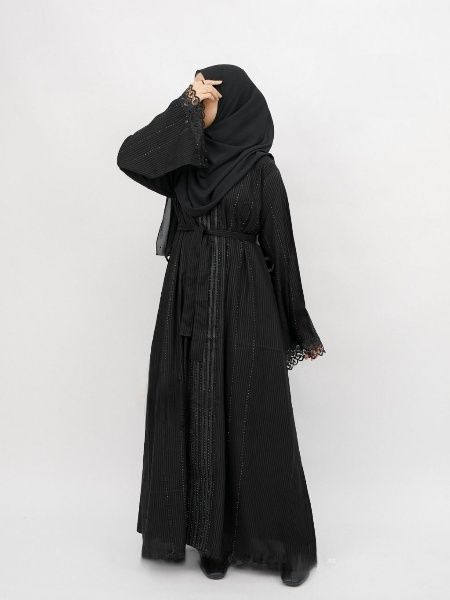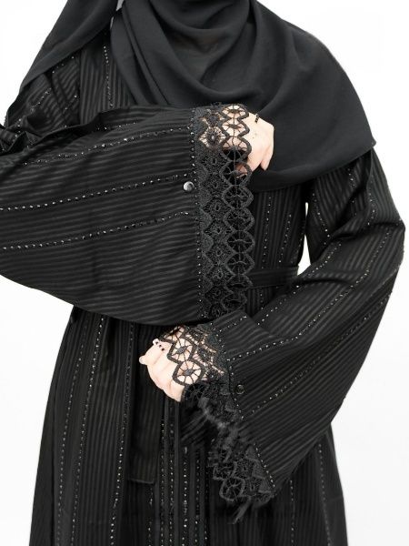 Abaya Dubai Jetblack Embos Garis2 Dg Mata2 Swarovski Hitam Cantik Dg Aksen Tgn Renda Hitam Elegan