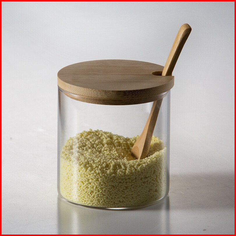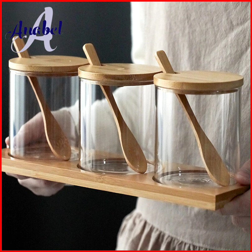 Tempat Bumbu Dapur 3pcs Set Jar Bumbu 3in1 Bahan Kaca Alas Kayu Sendok Kayu