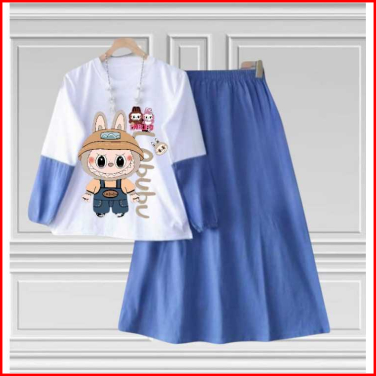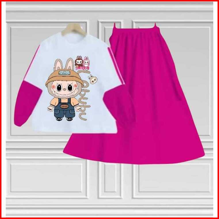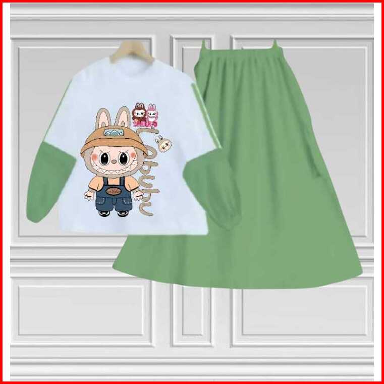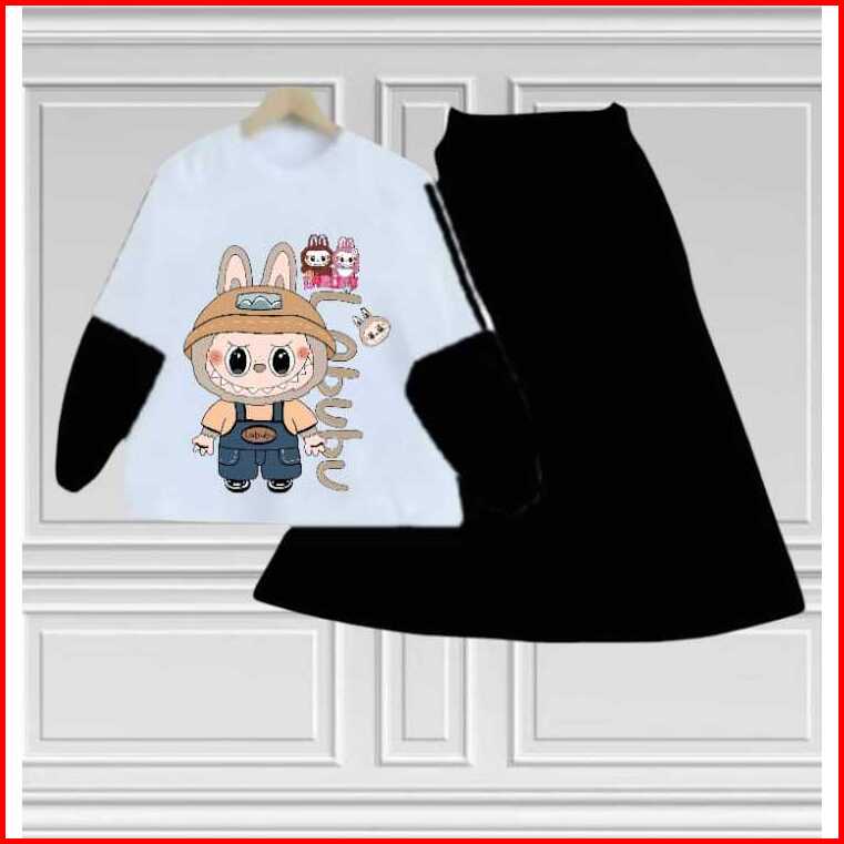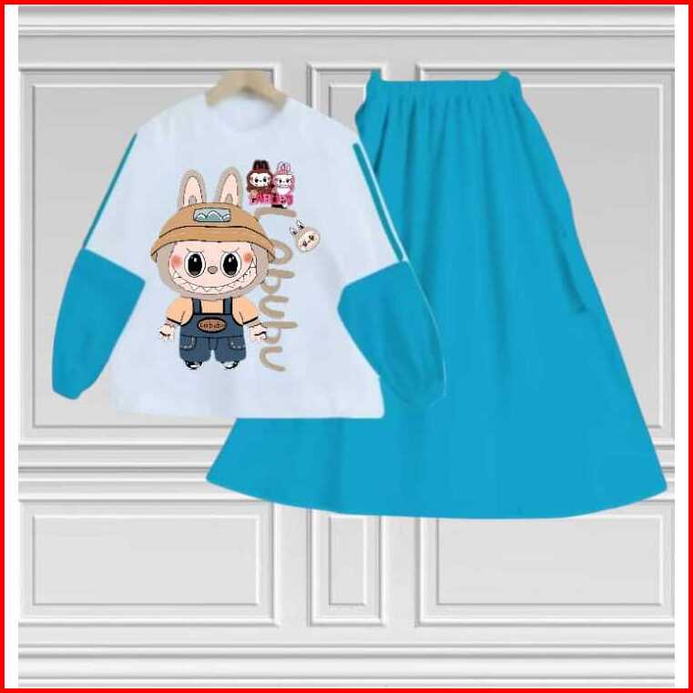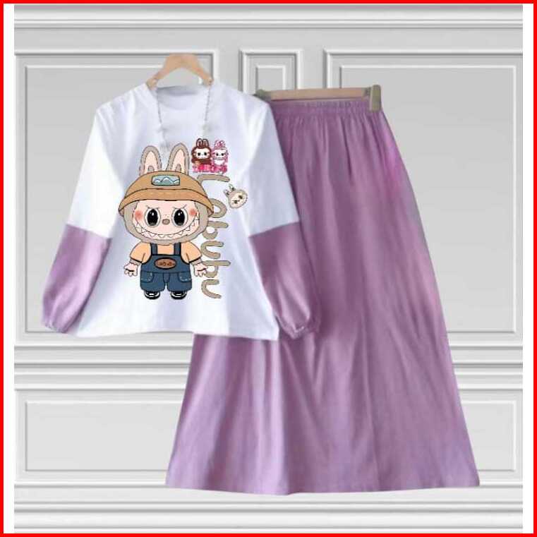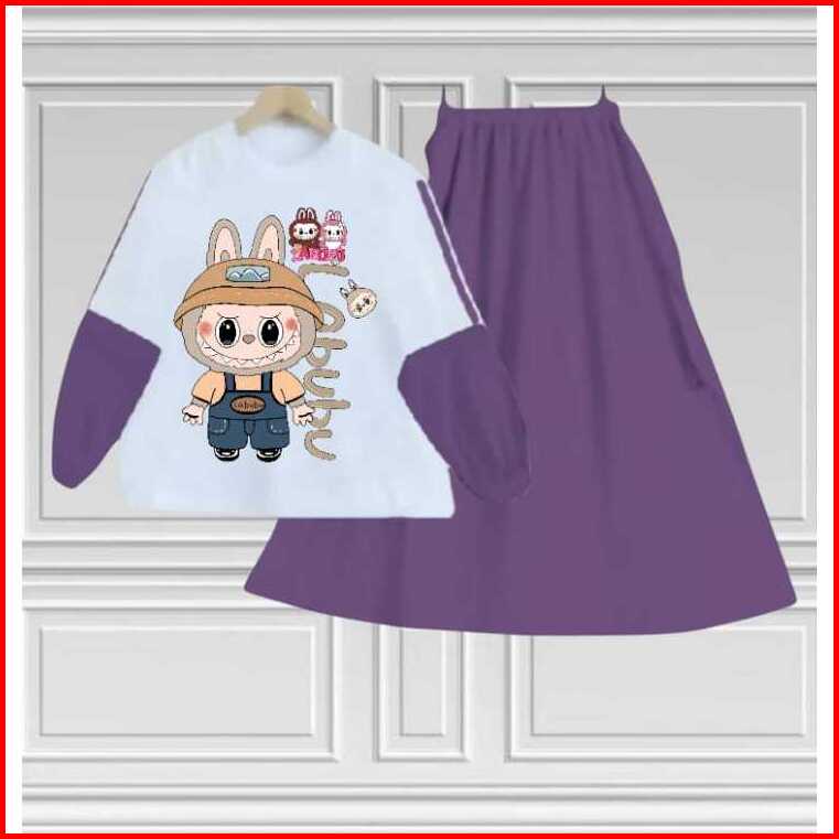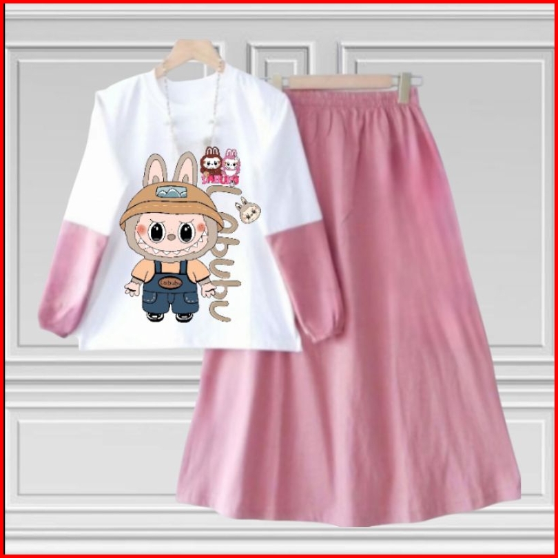 Setelan Set Rok Anak Labubu Anak Perempuan Terbaru Kids Bahan Crinkille Air Flow Usia 3-12 Tahun Fashion