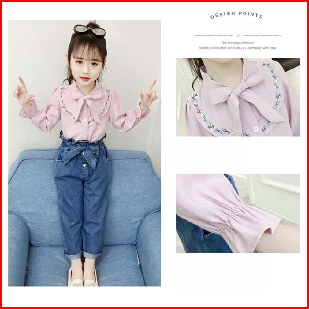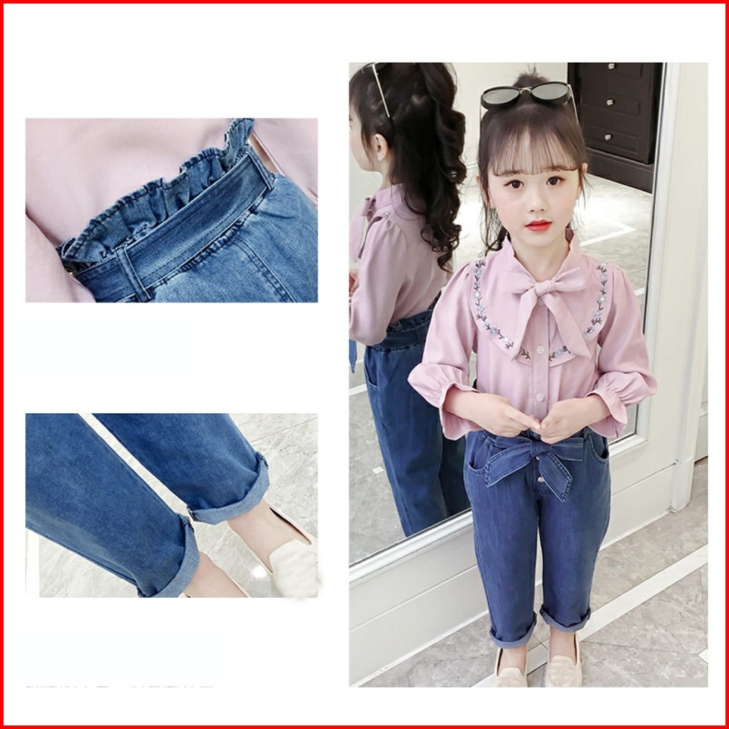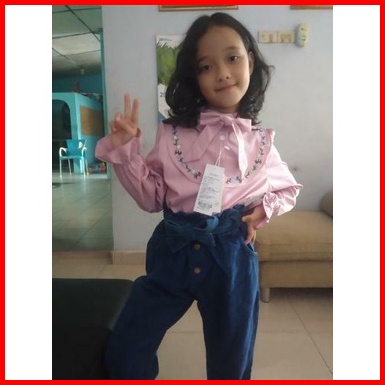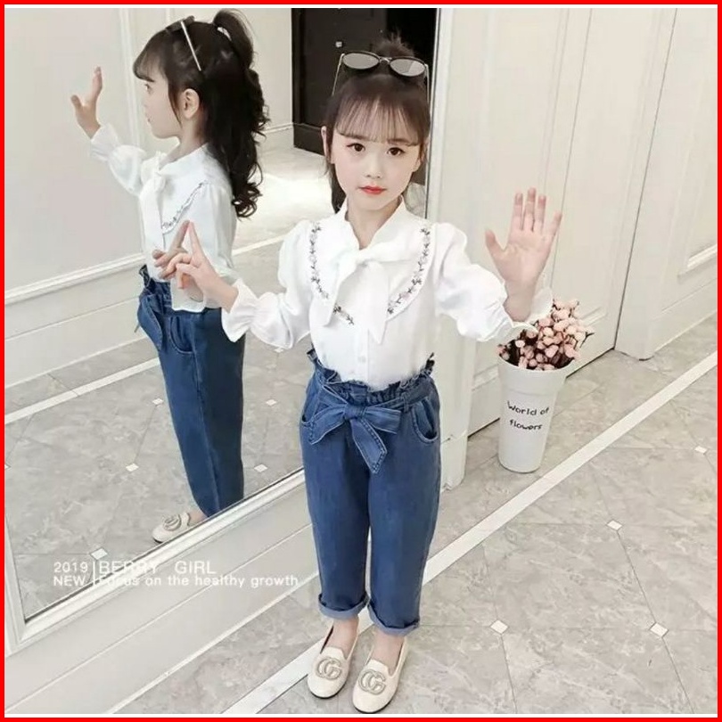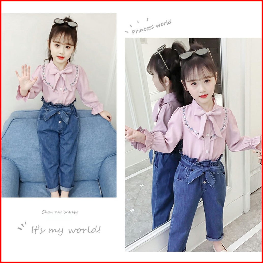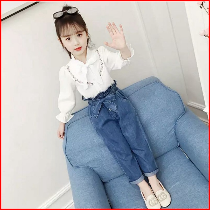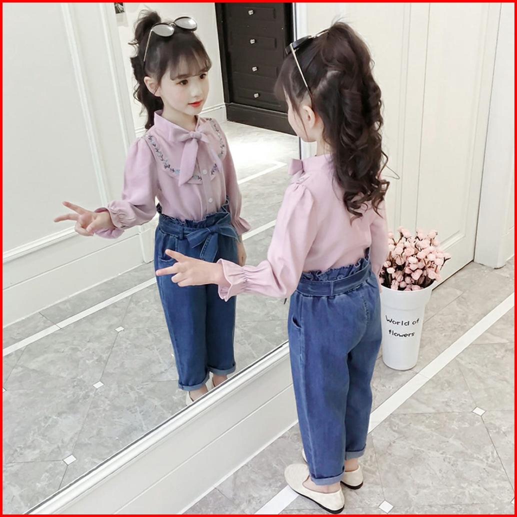 Paula Set Setelan Baju Anak Perempuan Fashion Korea Style Atasan Lengen Panjang Bordir Celana Jeans Panjang Full Karet U