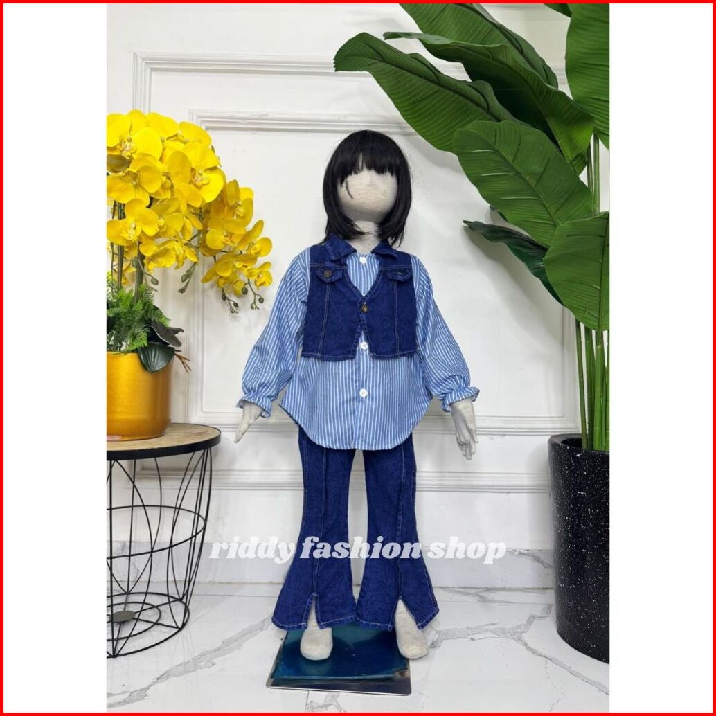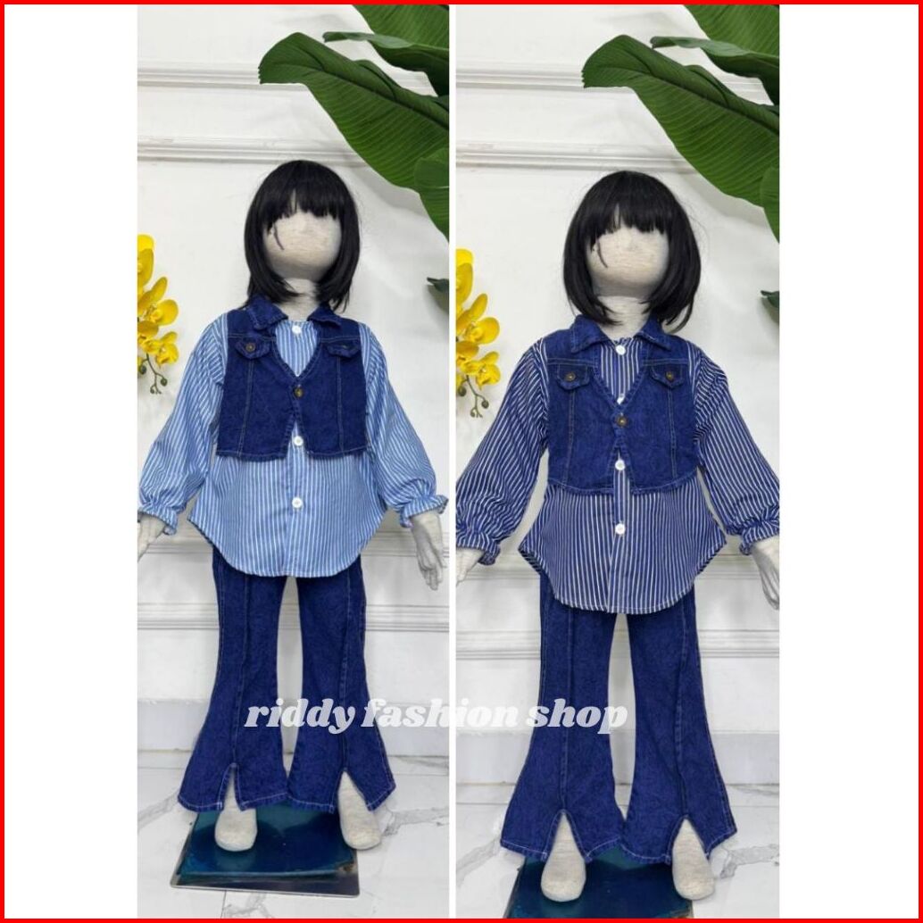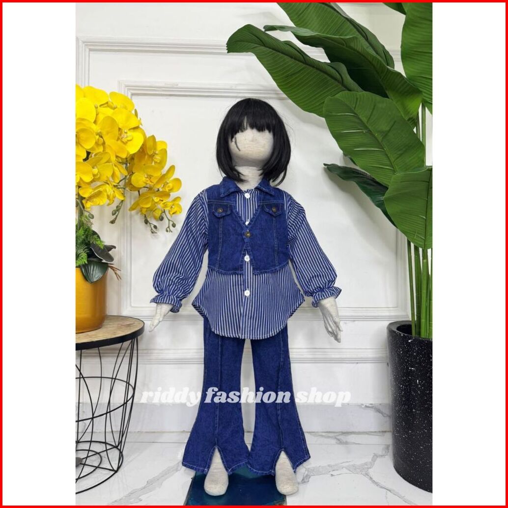 Setelan Fuji Salur Rompi Jeans Anak Perempuan Usia 3 - 12 Tahun Set Kombinasi Celana Cutbray - One Set Polos Rompi Jeans