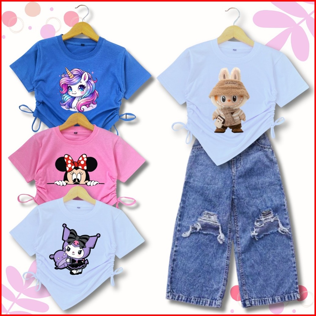 PUTIH LABUBU, PUTIH KUROMI, PUTIH KUCING, PINK LABUBU, PINK UNICORN, PINK MINNIE, DENIM LABUBU, DENIM MINNIE, DENIM KUROMI, DENIM KUCING, CROP SERUT 2 RANDOM