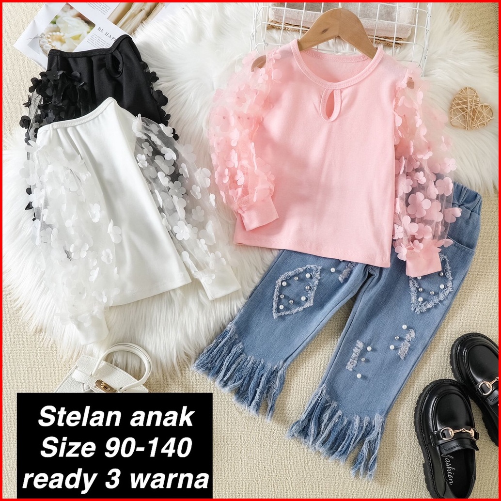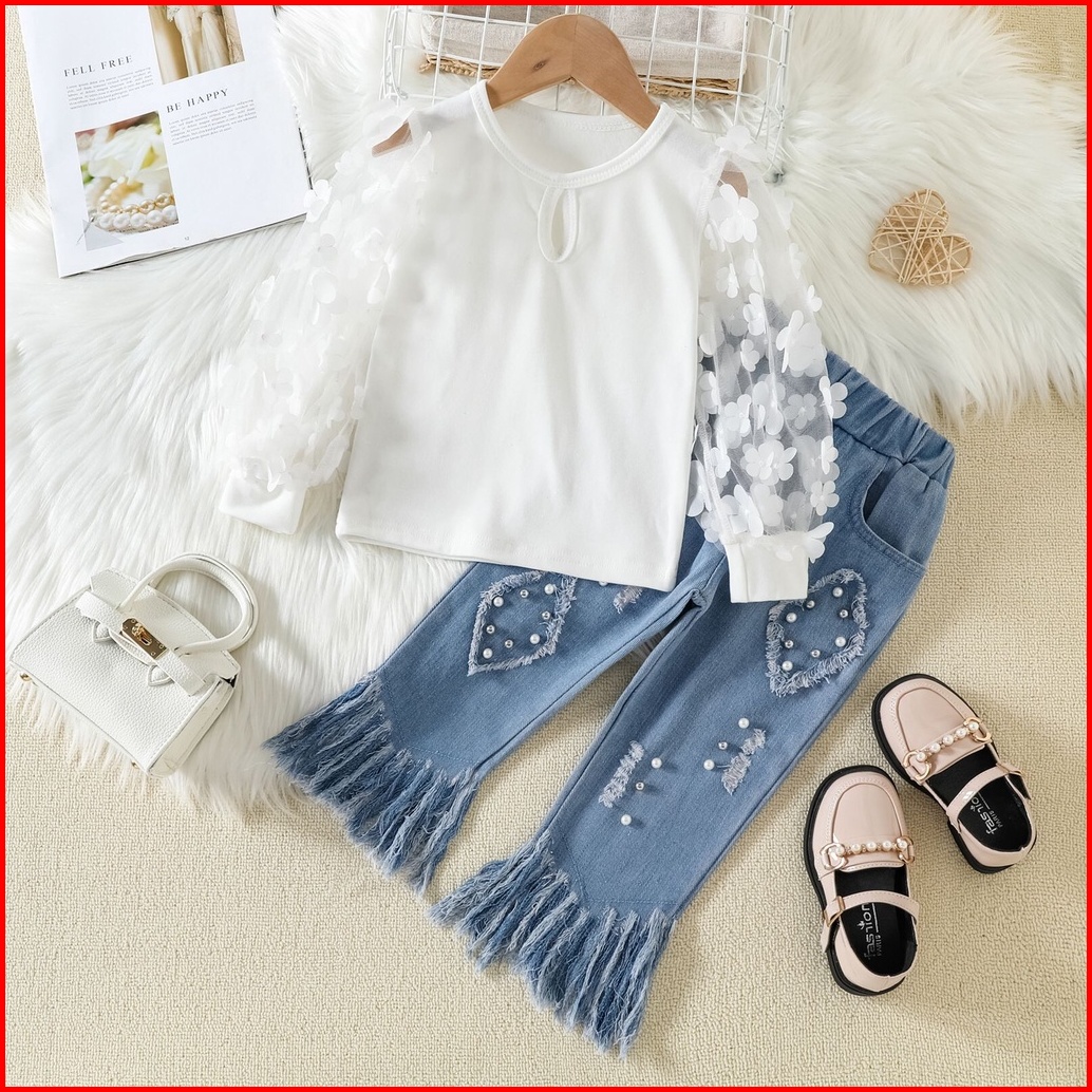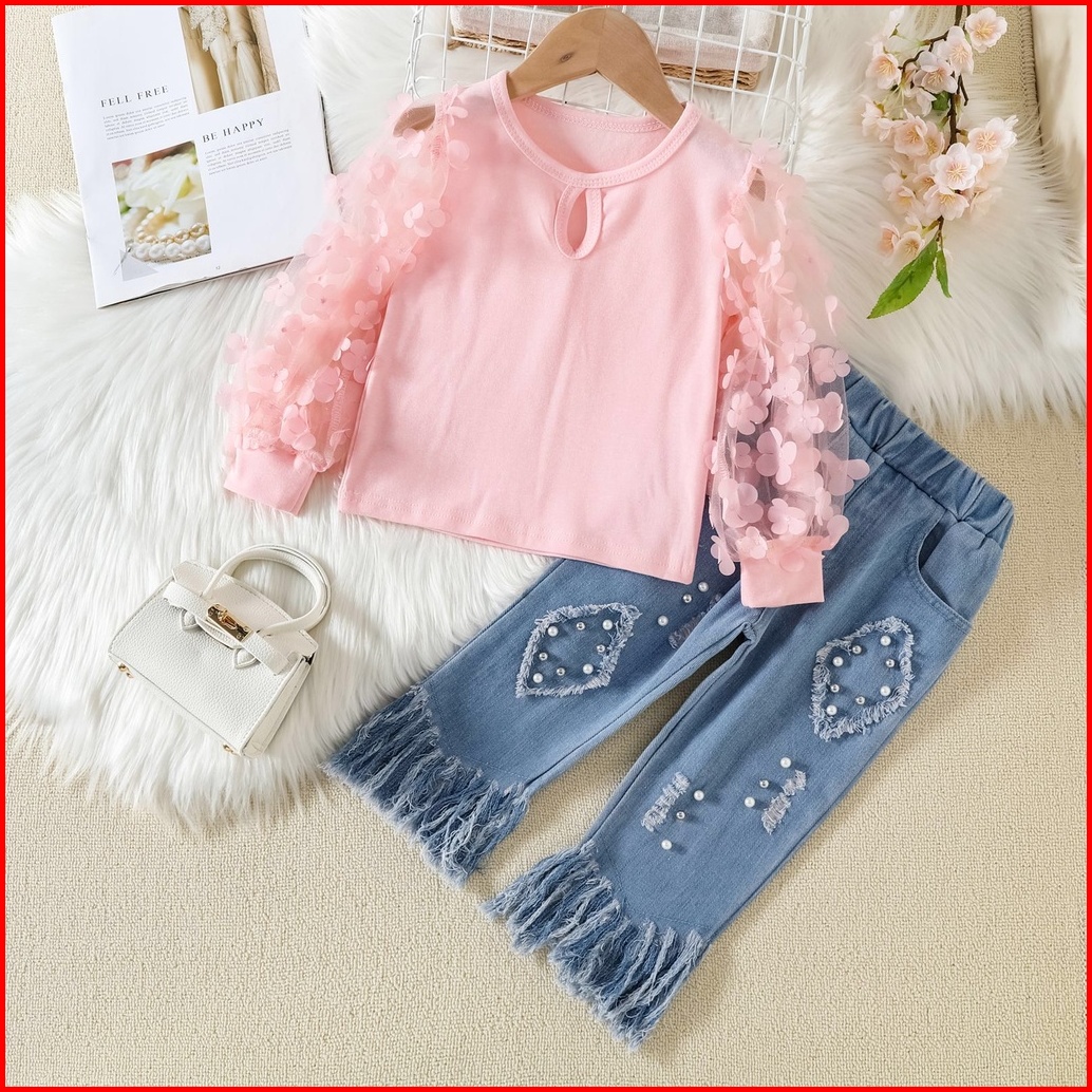 Loli-jkt Bs-335 Setelan Anak Rawis Bunga Mutiara Celana Jeans Size 90-140