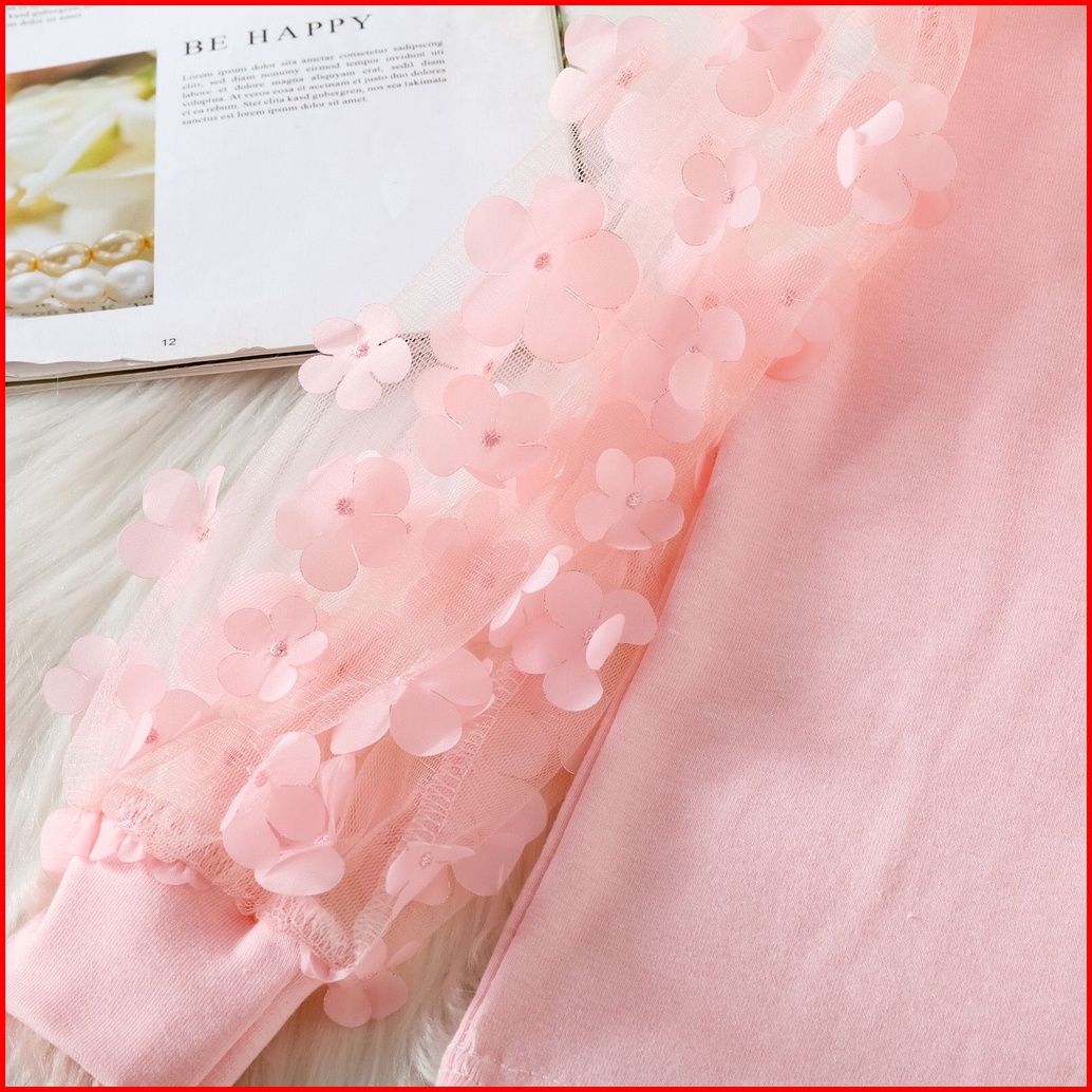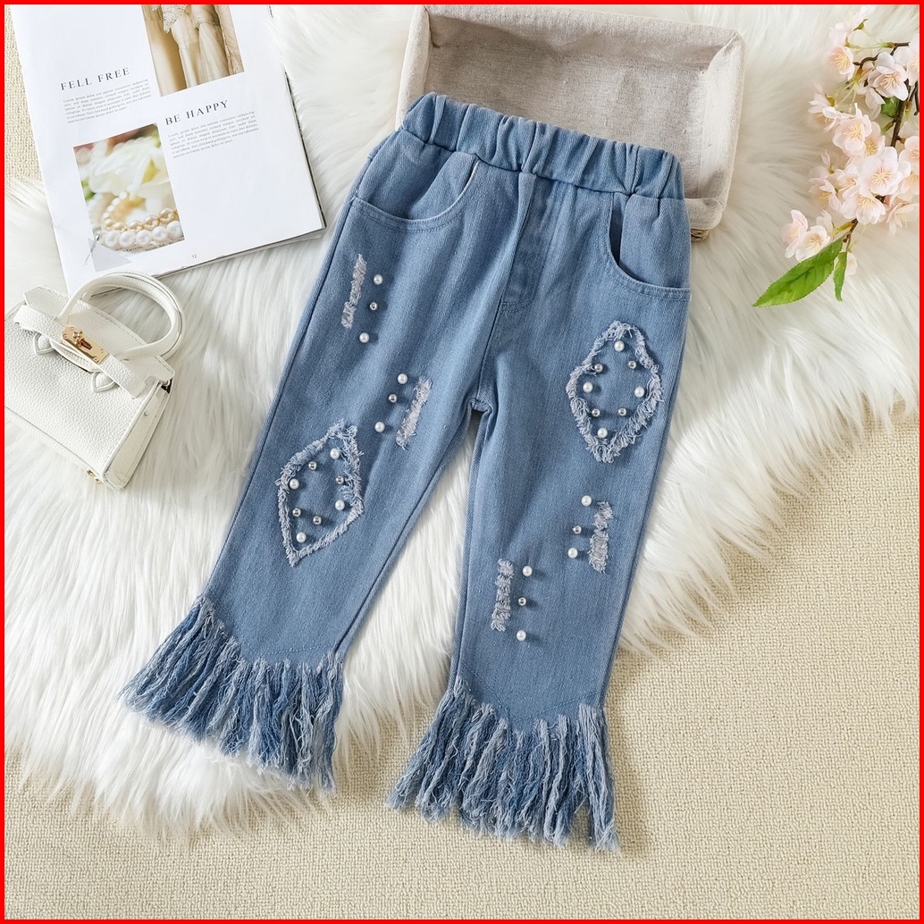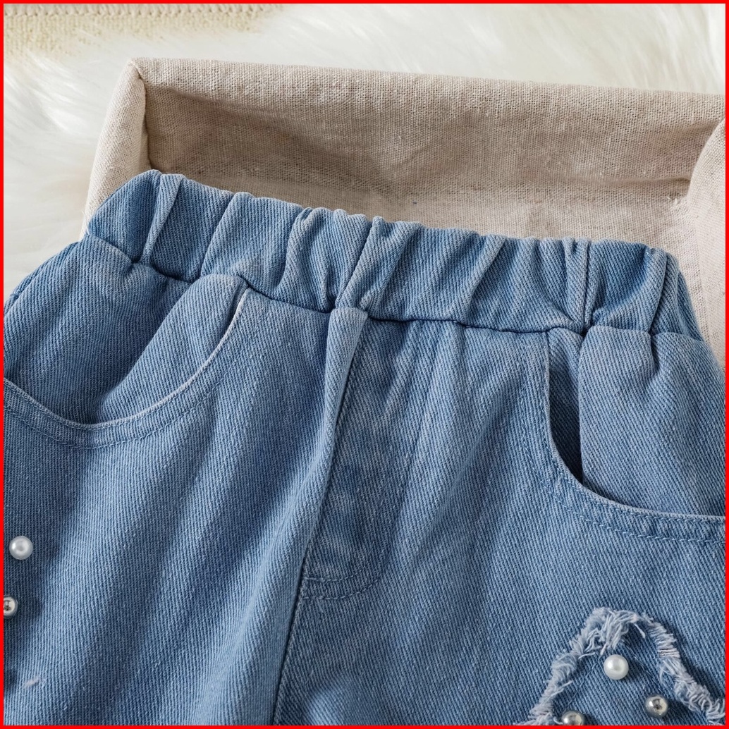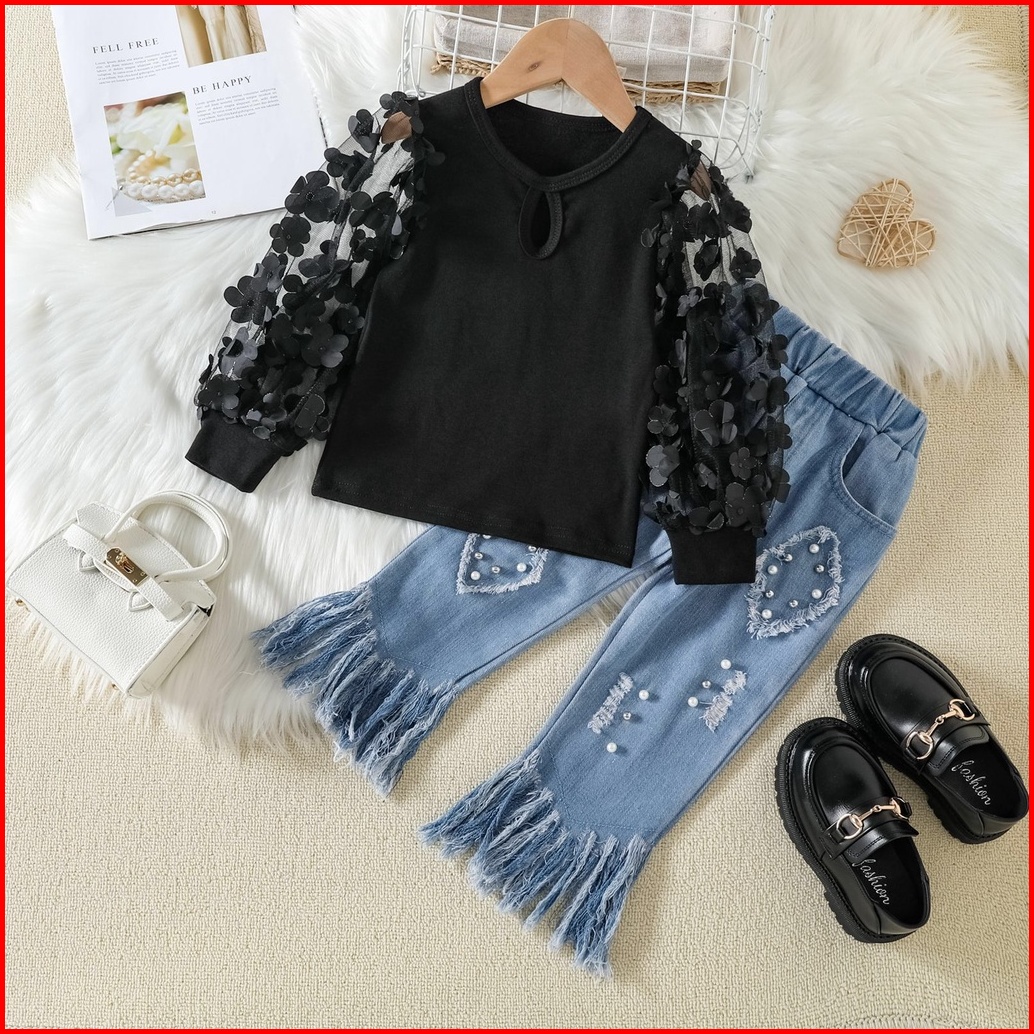 Loli-jkt Bs-335 Setelan Anak Rawis Bunga Mutiara Celana Jeans Size 90-140