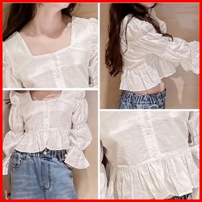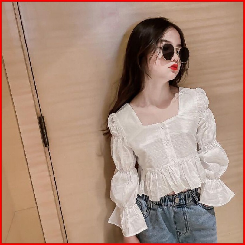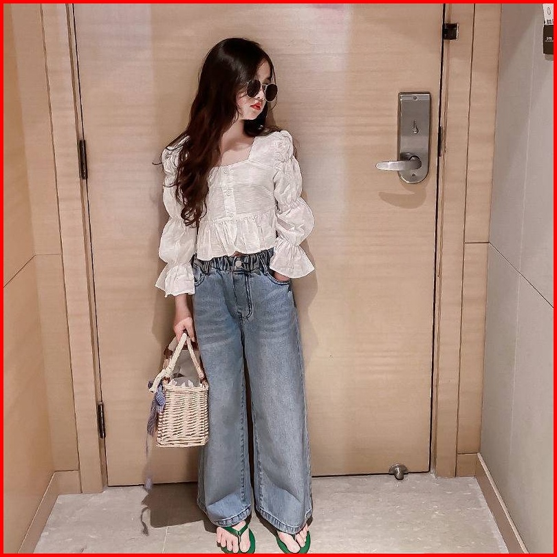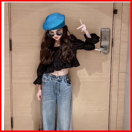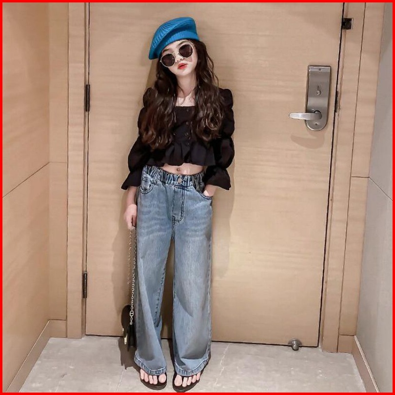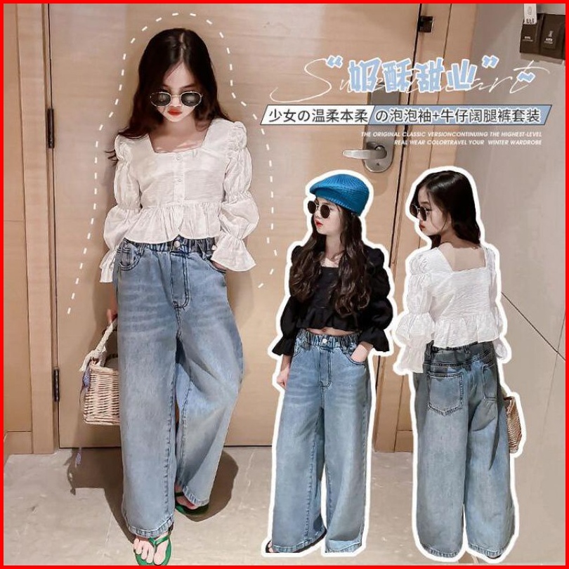 Kidsfo-24 Setelan Set Baju Anak Korea Perempuan Lengan Balon Celana Panjang Jeans Lurus