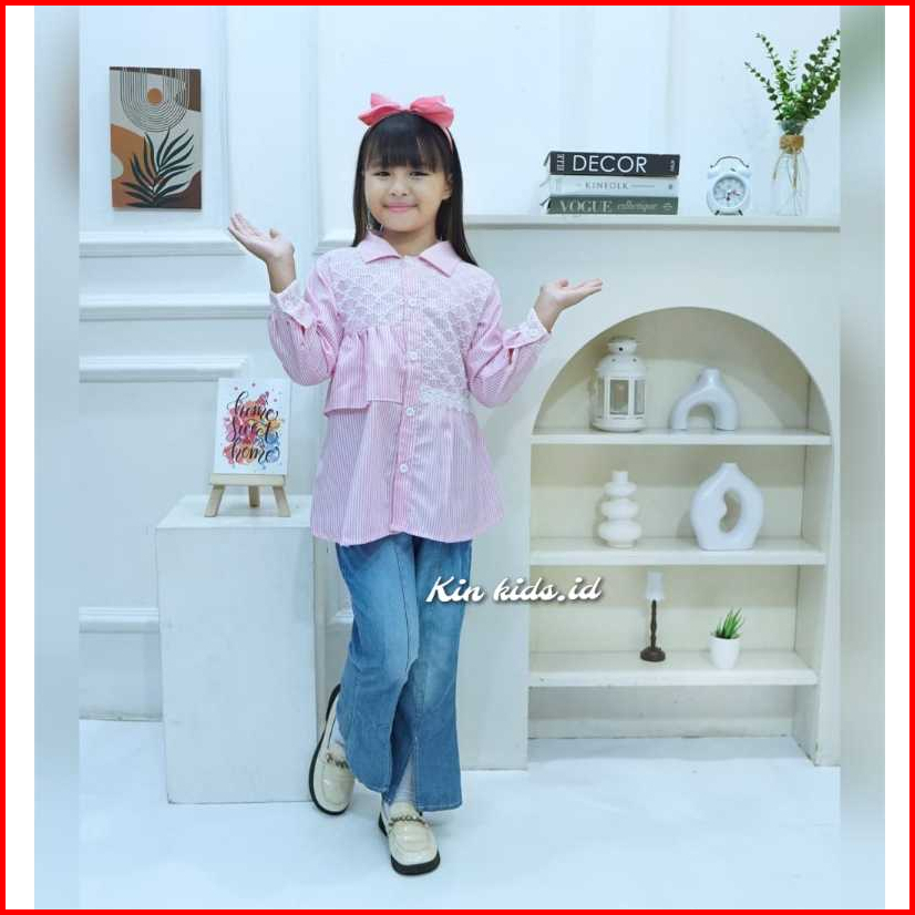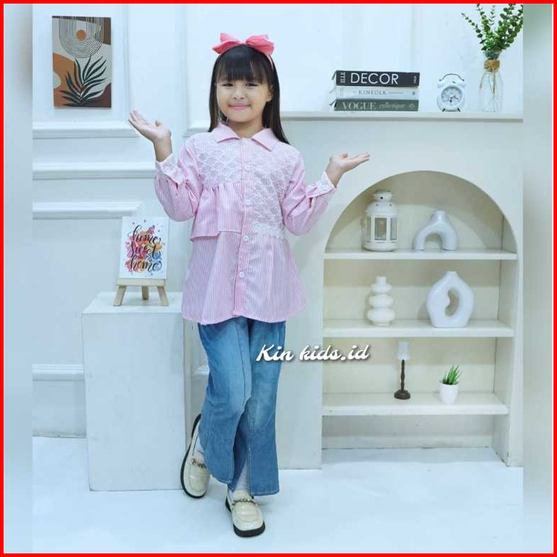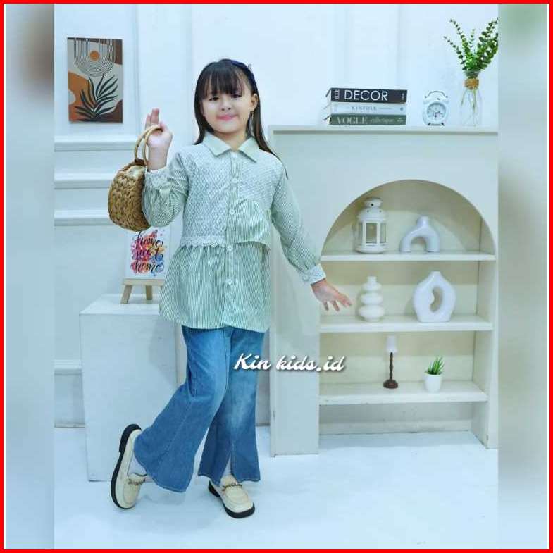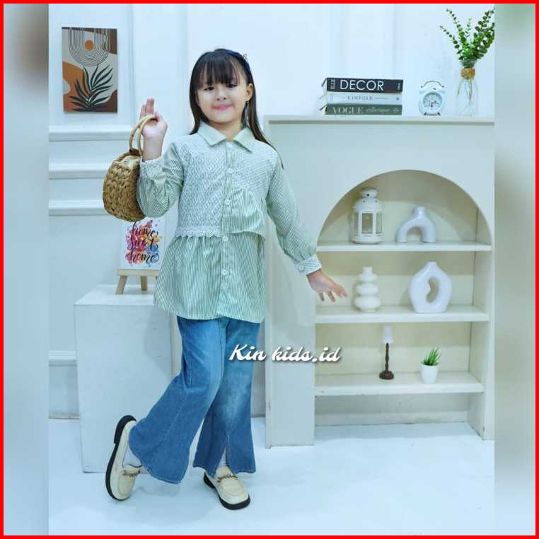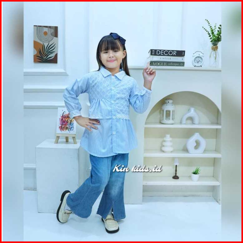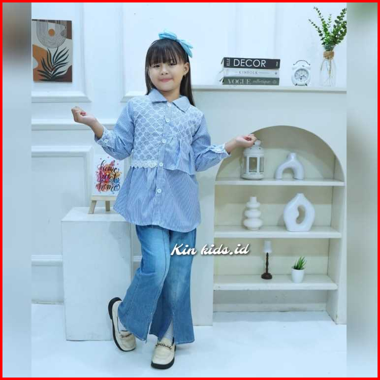 Setelan Anak Perempuan 4-12 Tahun Baju Kemeja Salur Dan Celana Jeans Cutbray - Kin Kids.id