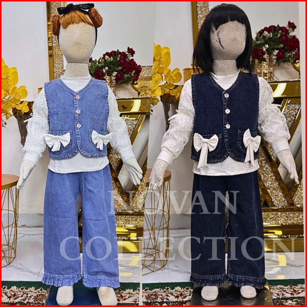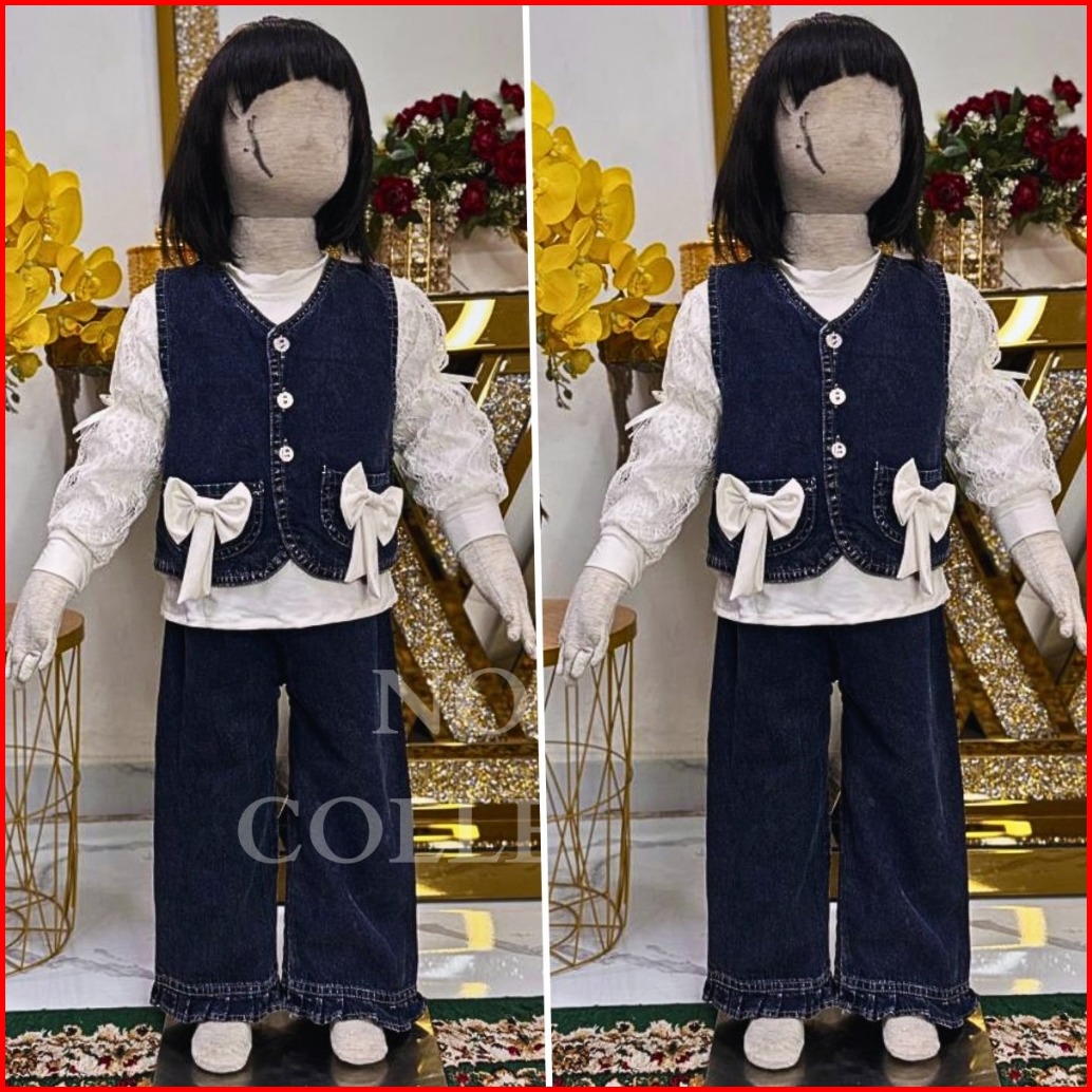 Stelan Jeans 3in1 Anak Perempuan Import Korean Style Kombinasi Brukat Pita Usia 3 - 12 Tahun Celana Jins Kulot Skena Set