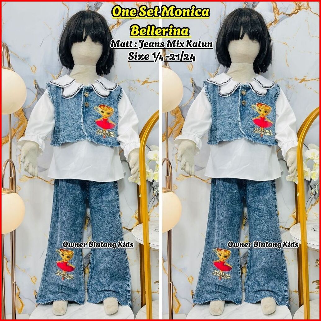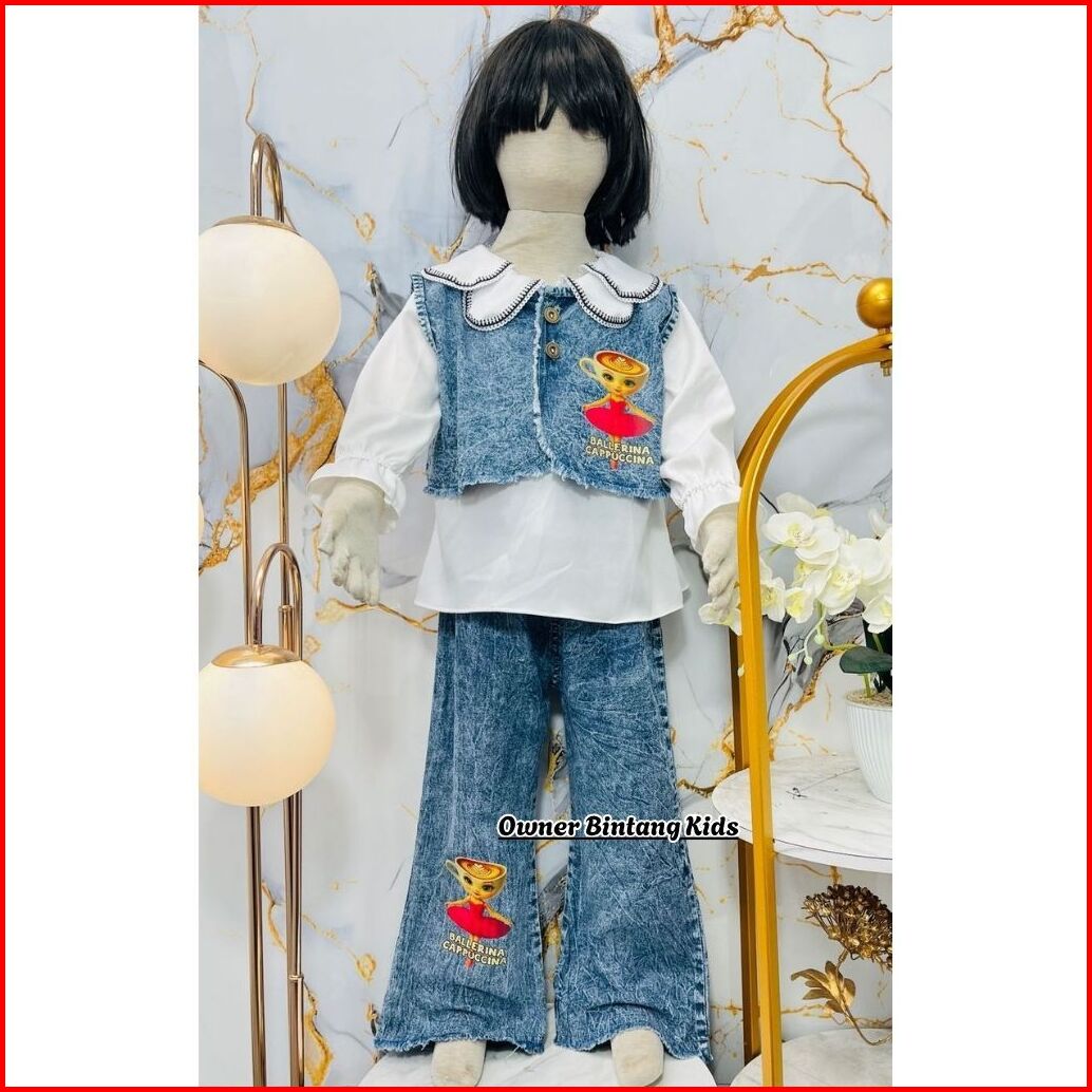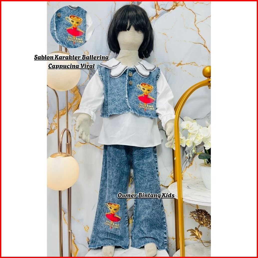 New Setelan Anak Monica Rompi Motif Ballerina Cappucina Virall Korean Style Celana Cutebray Usia 3-10 Tahun Bahan Jeans