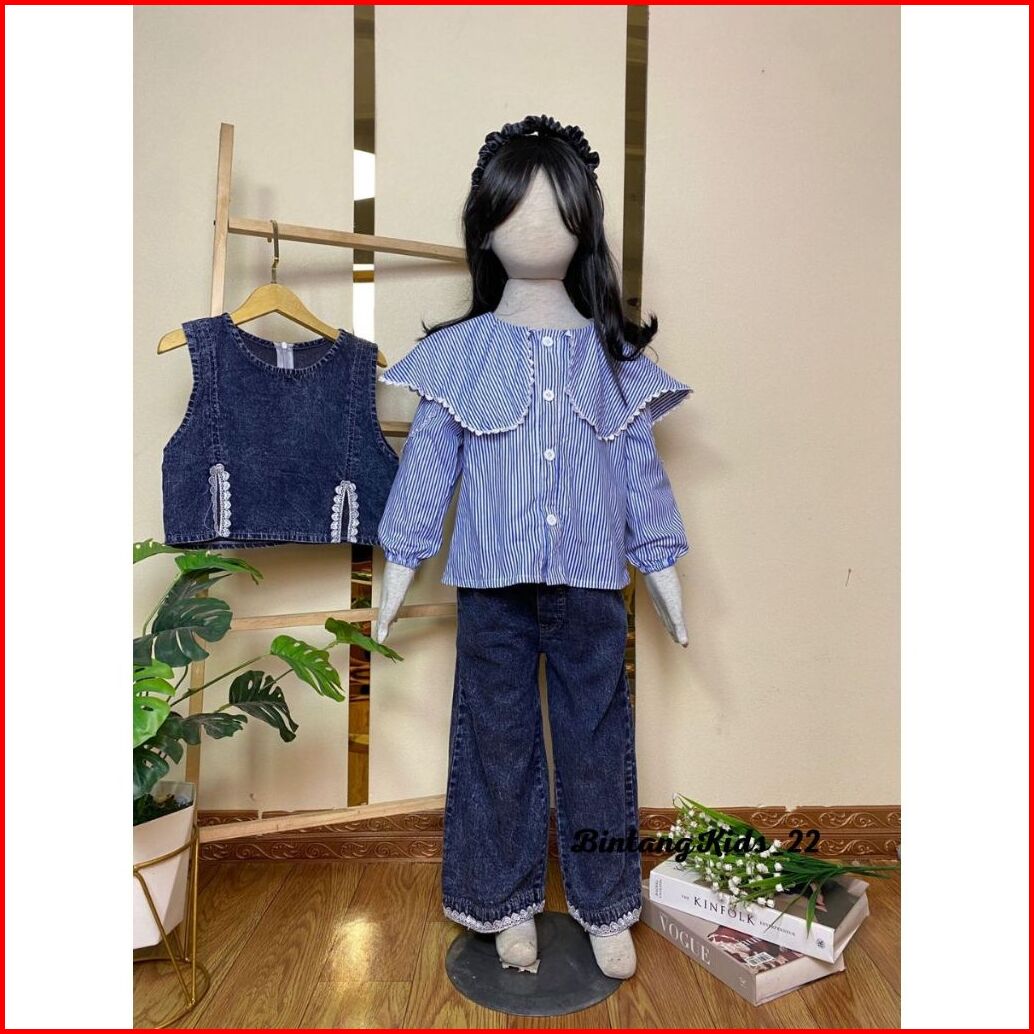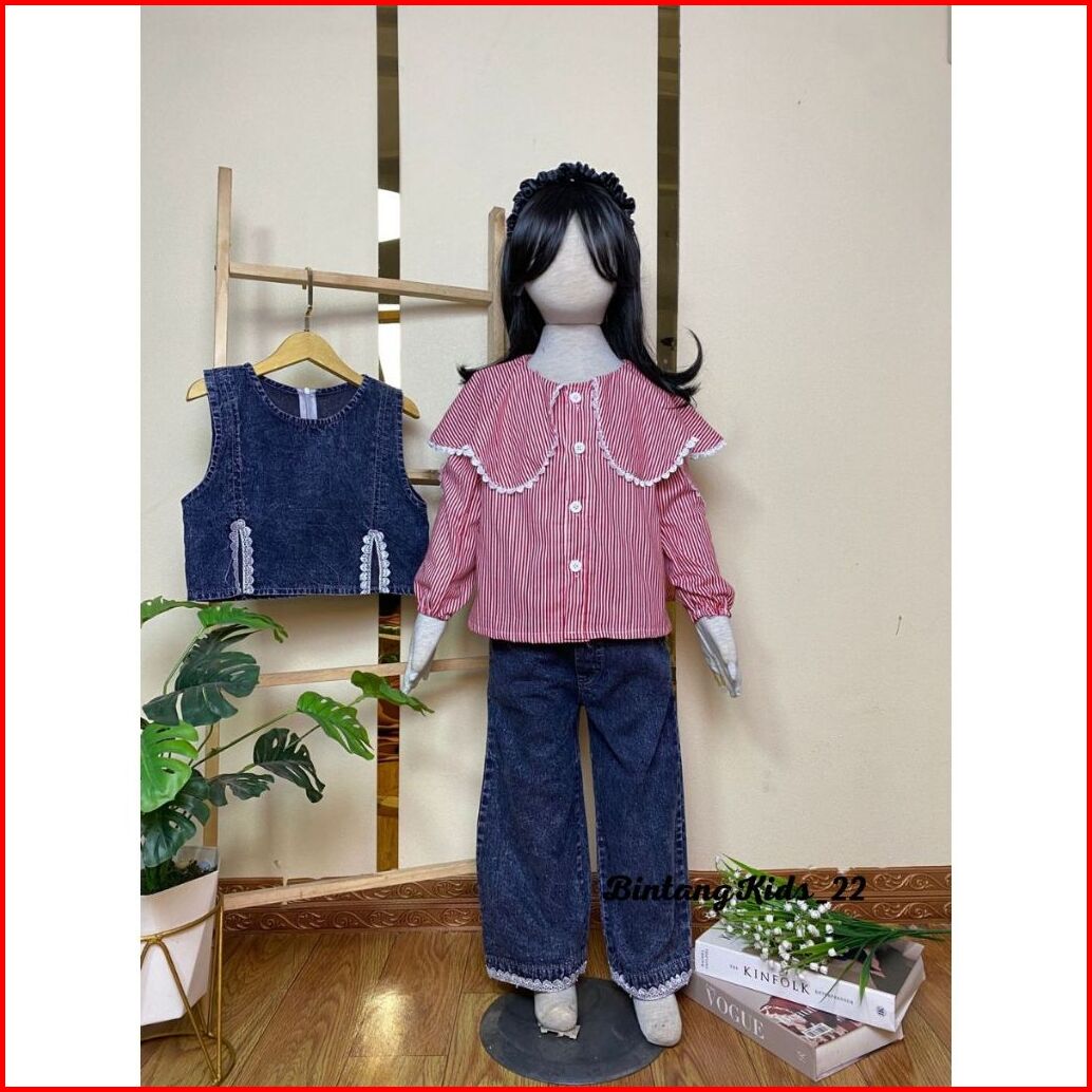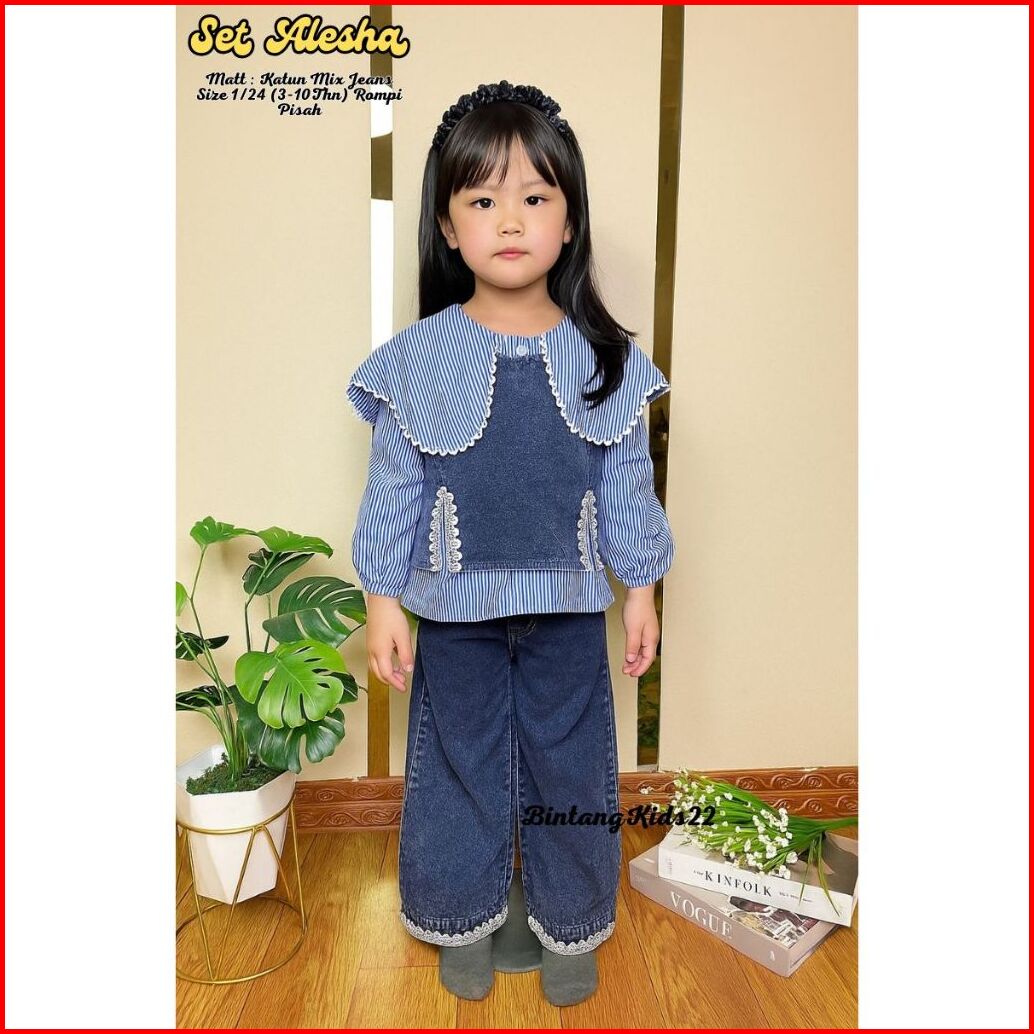 Setelan Alesha Rompi Jeans Lepas Pasang 3in1 Anak Perempuan Usia 3 Sampai 12 Tahun Bahan Katun Mix Jeans Premium Import