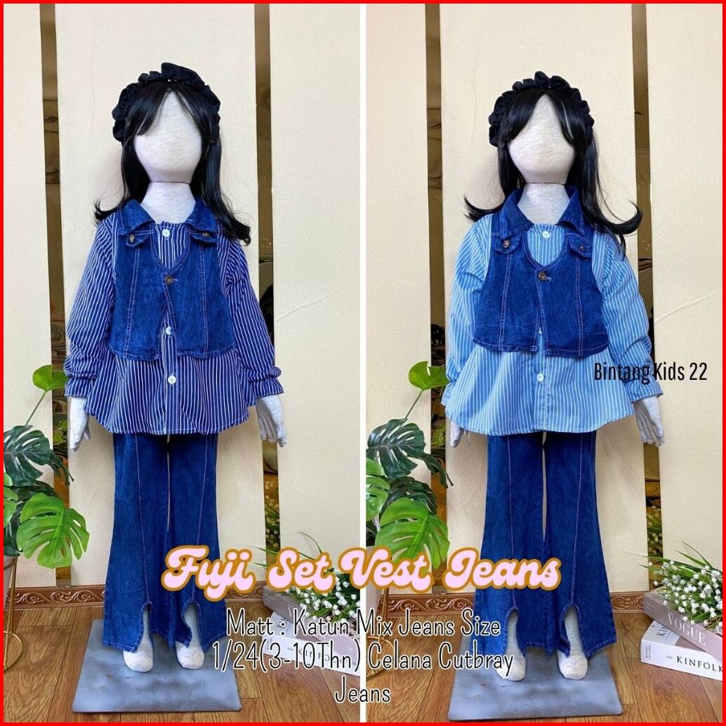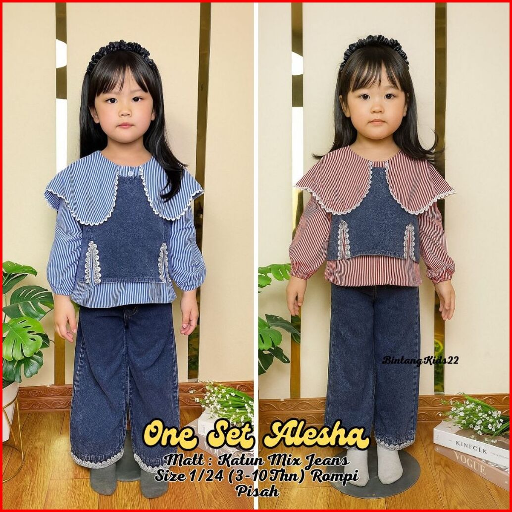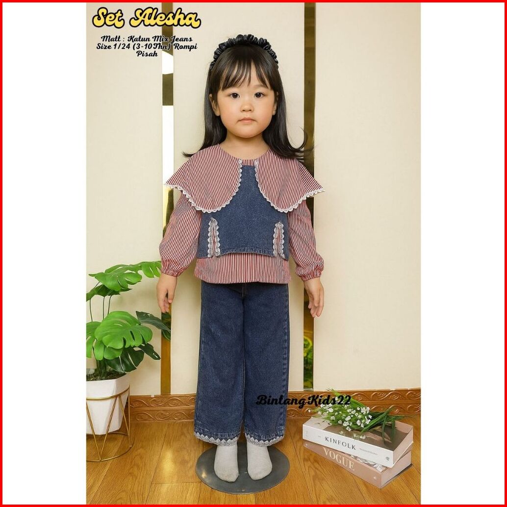 Setelan Alesha Rompi Jeans Lepas Pasang 3in1 Anak Perempuan Usia 3 Sampai 12 Tahun Bahan Katun Mix Jeans Premium Import