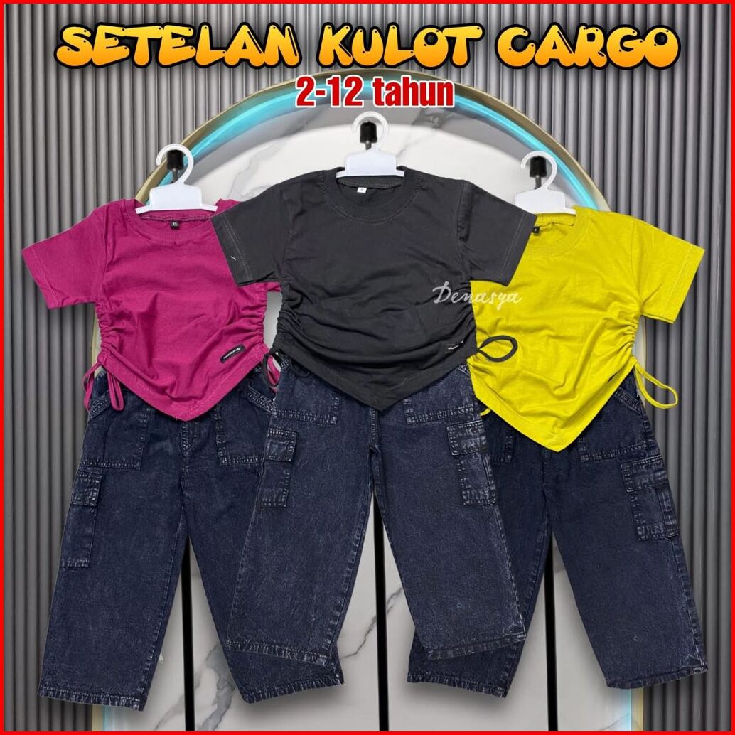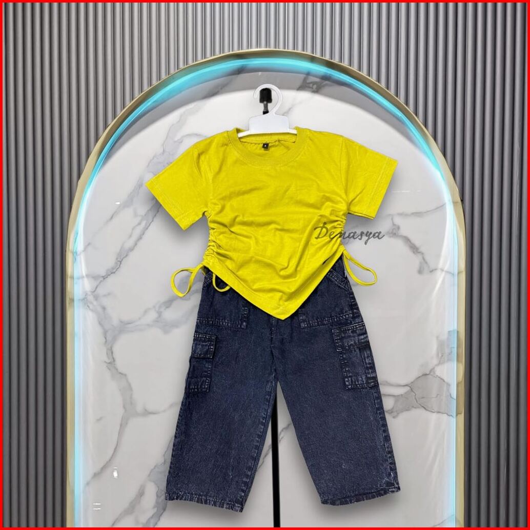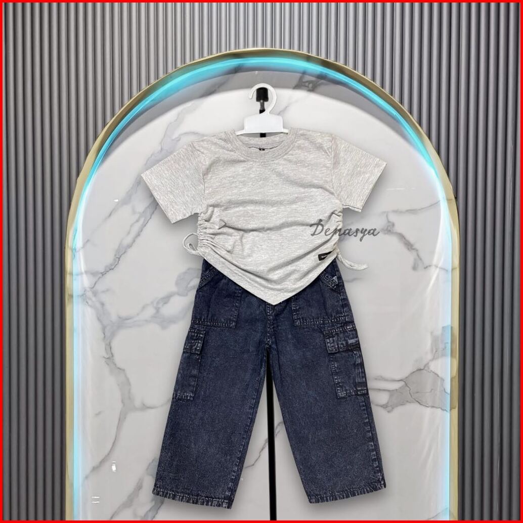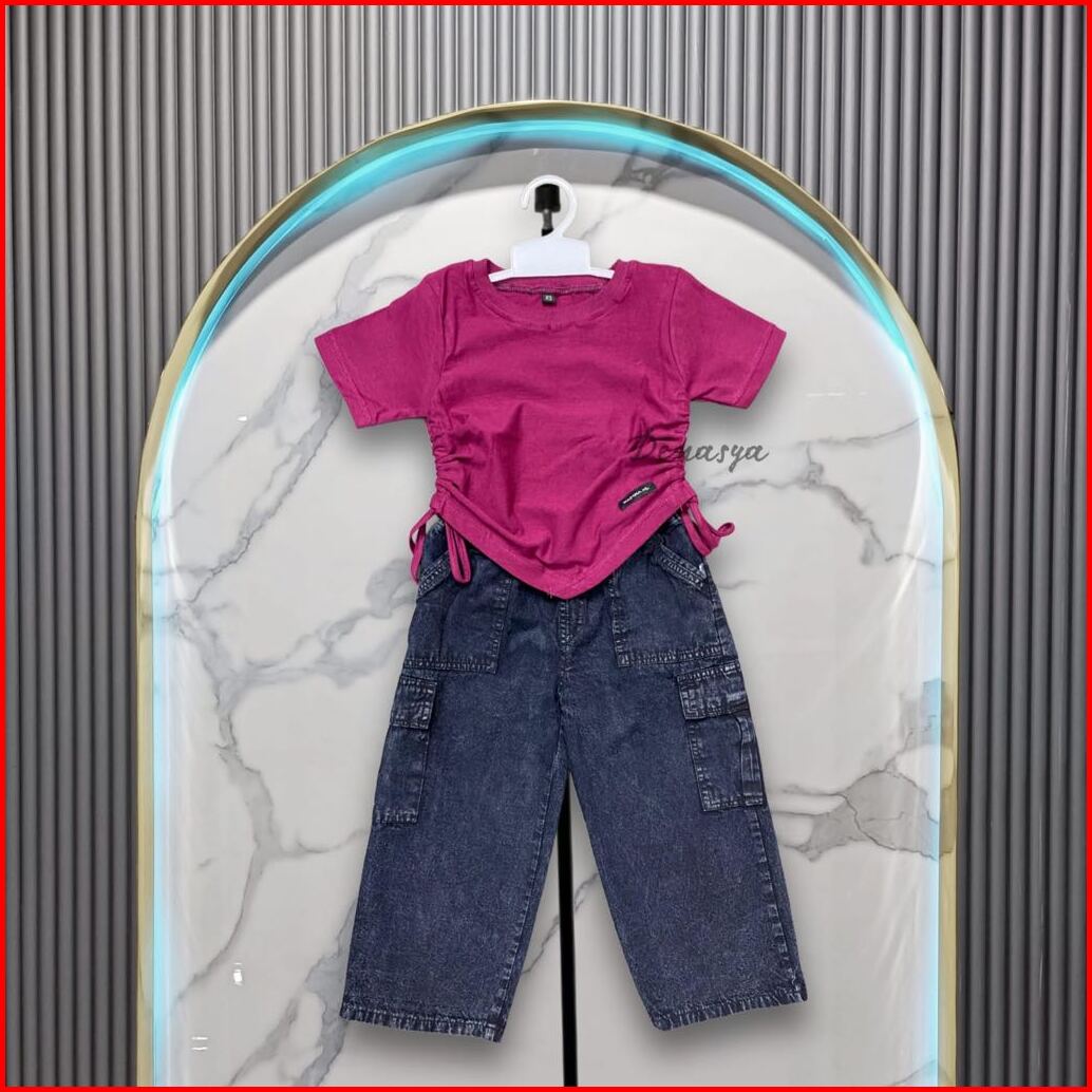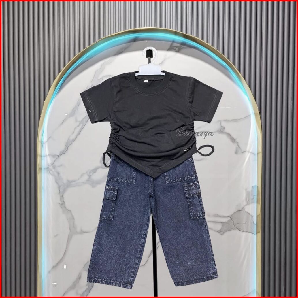 Setelan Anak Perempuan Kekinian One Set Kulot Cargo Jeans Snowblack Kaos Serut Crop Top Anak Usia 2-12 Tahun