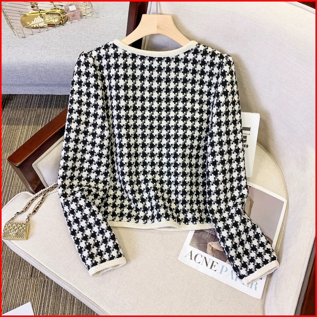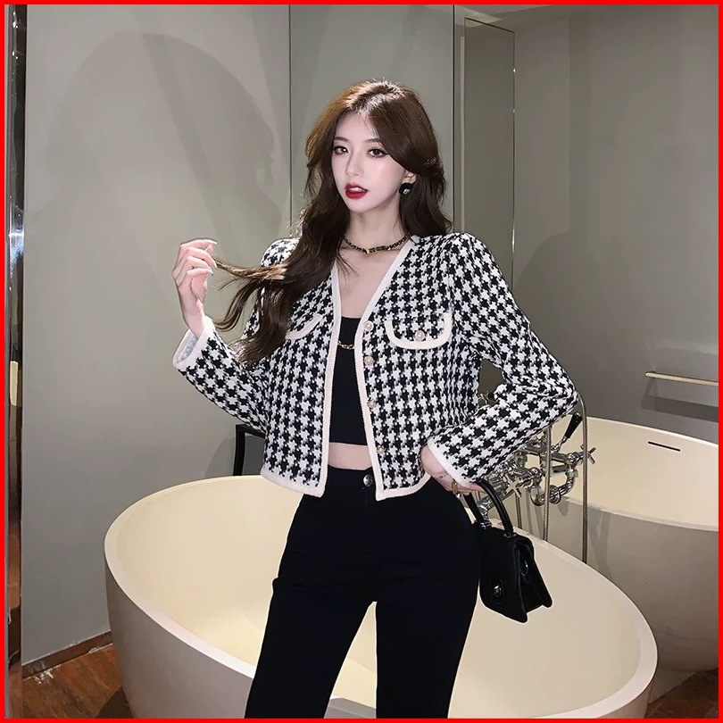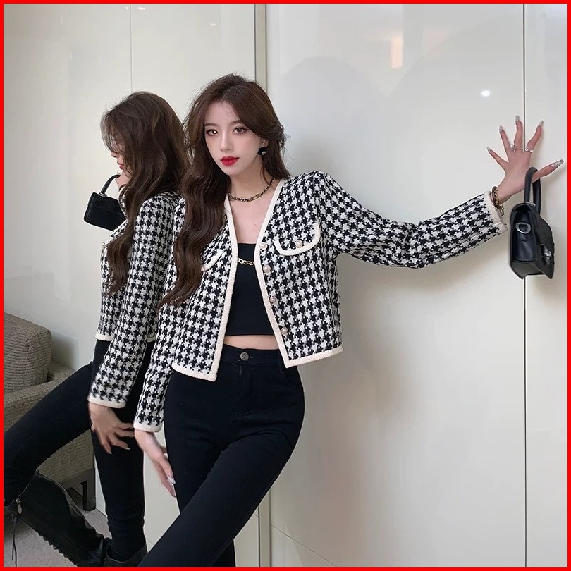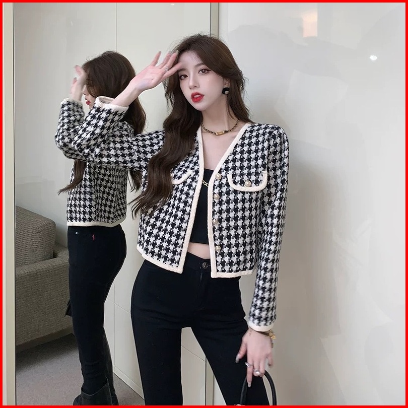 Forteid Korean Style Cardigan Lengan Panjan Wanita Crop Kotak-kotak Kardigan Crop Vintage Baju Atasan Wanita 2 Warna Jac