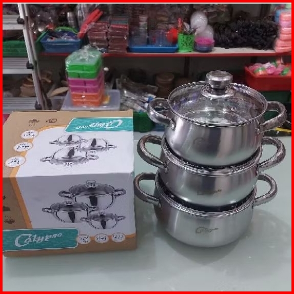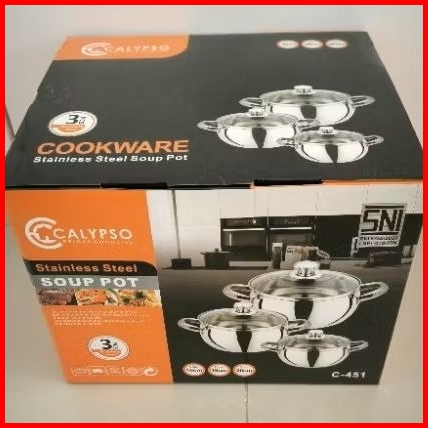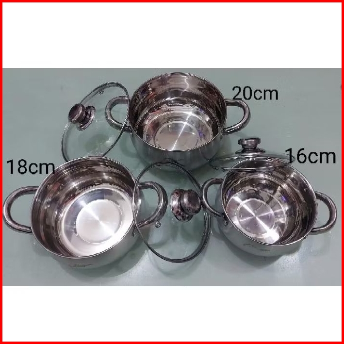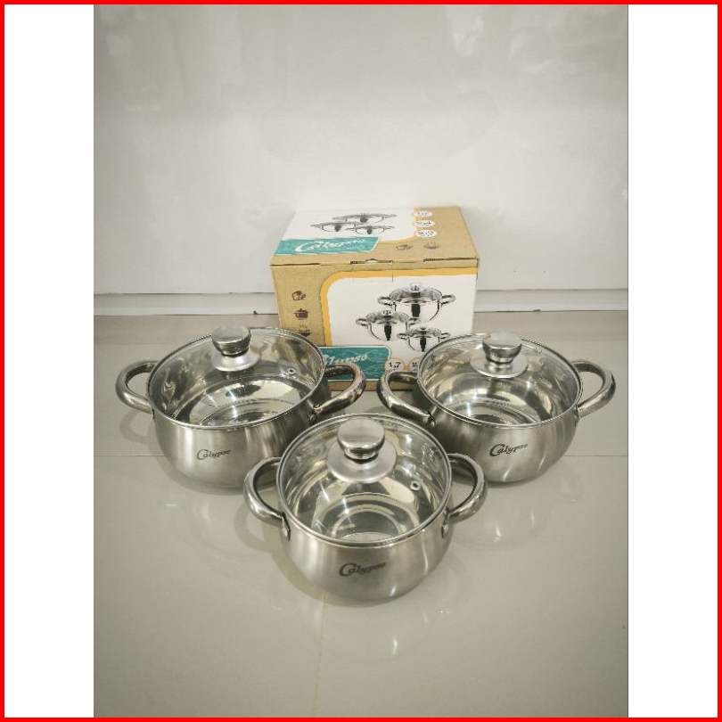 Panci Set Stainless Steel Calypso Isi 3pcs Tutup Kaca Bahan Tebal