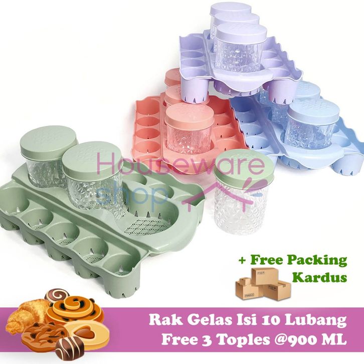 Toples Lebaran Rak Aqua Gelas 10 LubaToples Lebaran Rakng + 3Pcs Toples / Nampan Beckel Kombinasi Toples dan Wadah Gelas