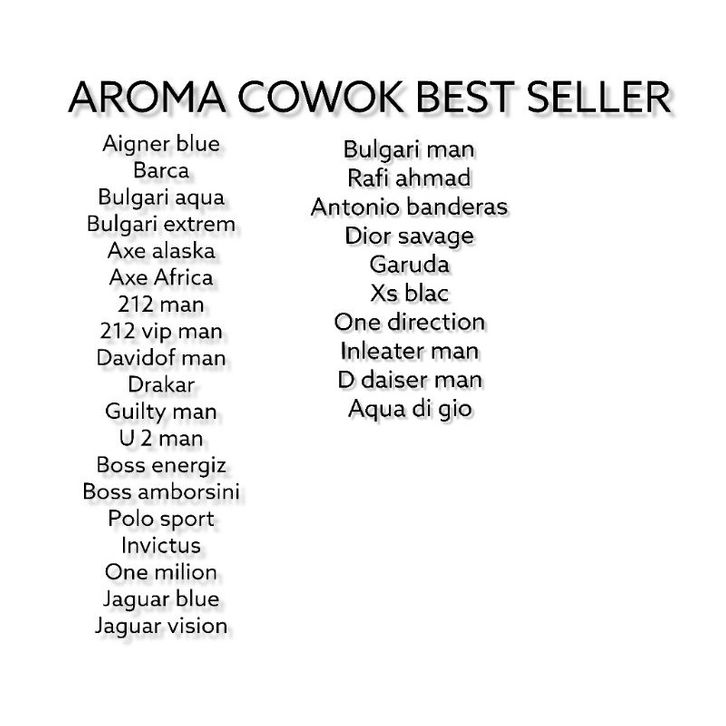 212 MAN, AIGNER BLUE, ANGEL HEART, ANNA SUI DREAM, AVRIL, Aqua kiss, BACCARAT, BARCELONA, BL4CK 0P1UM, BOOMSELL, BUBLE GUM, BULGARI AQUA, BULGARI EXTRIM, CUDLLE, D&G IMPRATIC, D&G LIGHT BLUE, D1OR SAVAG3, DANHIL BLUE, DAVIDOF MAN, ENTERNITY MAN, ES CHERY, ES SEXY, INCANTO SHINE, INVICTUS, JAGU4R VISION, JAGUAR BLUE, JLO STILL, K3N20 BATANG, LOVELY, LUX, MAHER ZAIN, MEL0N, MIDNIGHT FANTASI, NAGITA SLAVINA, OLL4 RAMLAN, ONE MILION LUCKY, PARIS HERIS, PARIS HILTON, PARIS SIREN, PINK CIFFON, POLO SPORT, RAFFI AHMAD, REQUES/LAINNYA, ROMANTIC, SARAH JESIKA, SCANDALOUS, SELENA GOMES, SO SEXY, SOFT, STROWBERY, TAYLOR SWIFT, VANILLA, VERSACE EROS, VIP MAN, Z4R4 GARDENIA, ZWITSAL