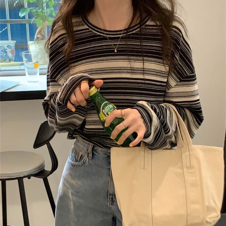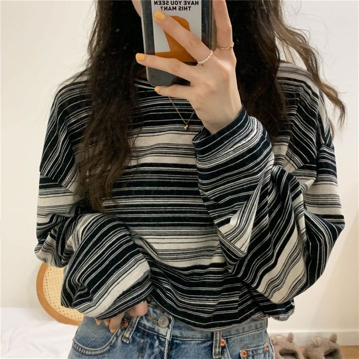 Fashion Style Korean Wanita T Shirt Bergaris Atasan Lengan Panjang Top Berbahan Katun Berkualitas Premium Tinggi Stylish