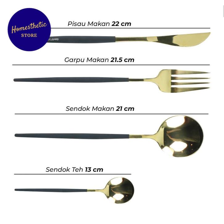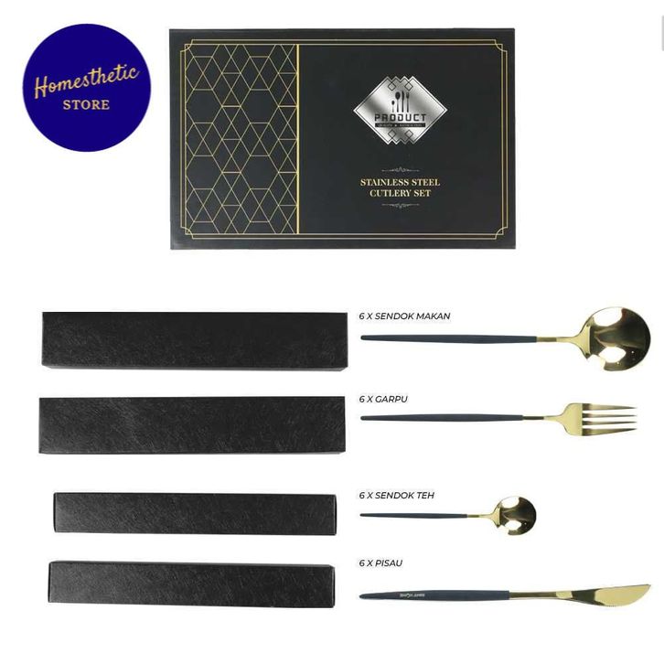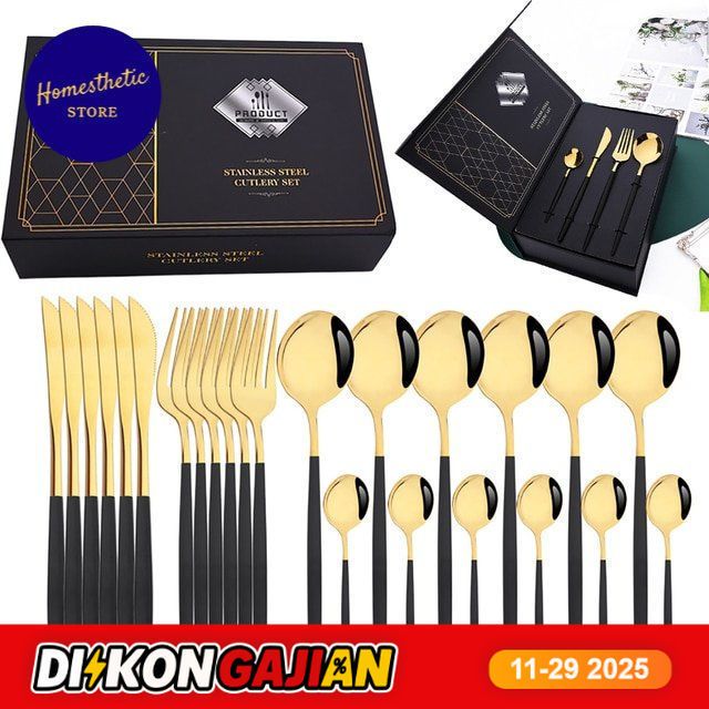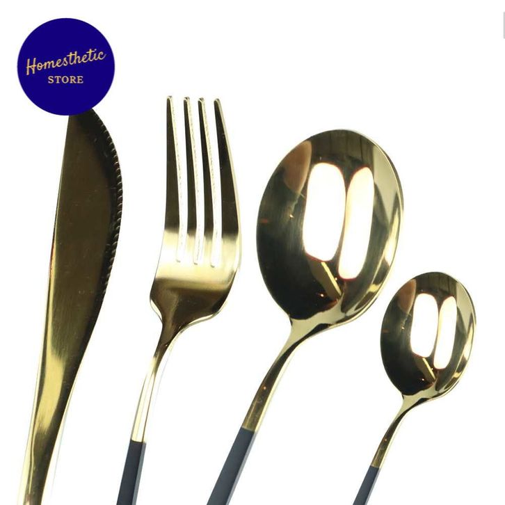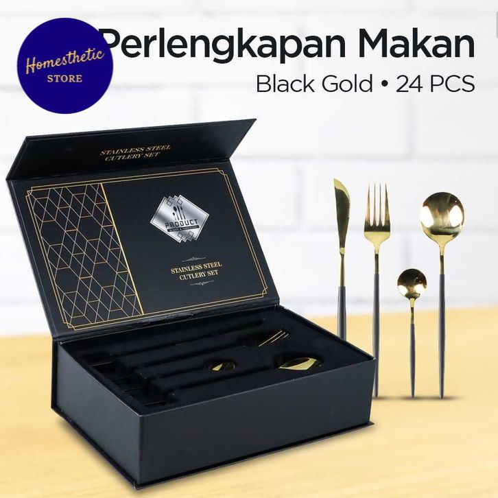 FREE ONGKIR_ Set Perlengkapan Alat Makan Sendok Garpu Pisau Korea Mewah 24 PCS Stainless Steel Hitam Gold