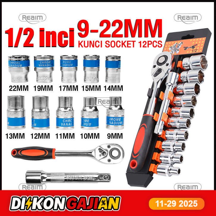 Reaim Kunci Set 1/2inci Socket Sok 12pcs CR-V Kunci Sok alat perkakas lengkap motor Rachet Handle Multifungsi kunci set