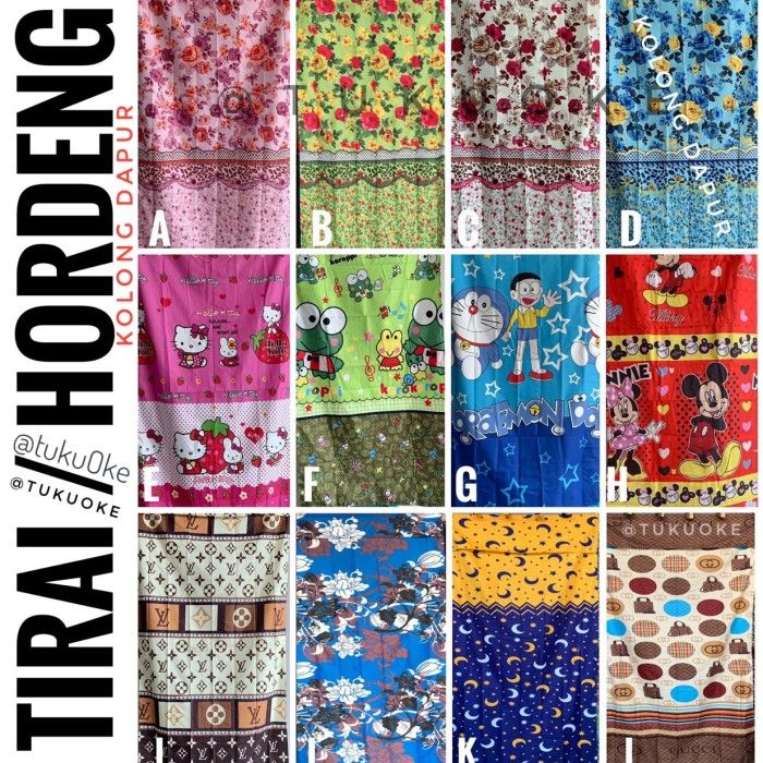 A SHABY PINK, B SHABY HIJAU, C SHABY CREAM, D SHABY BIRU, E HELOKITY, F KEROPI, G DORAEMON, H MIKIMOUSE, I LV, J MANOHARA BIRU, K STARMOON, L GUCC