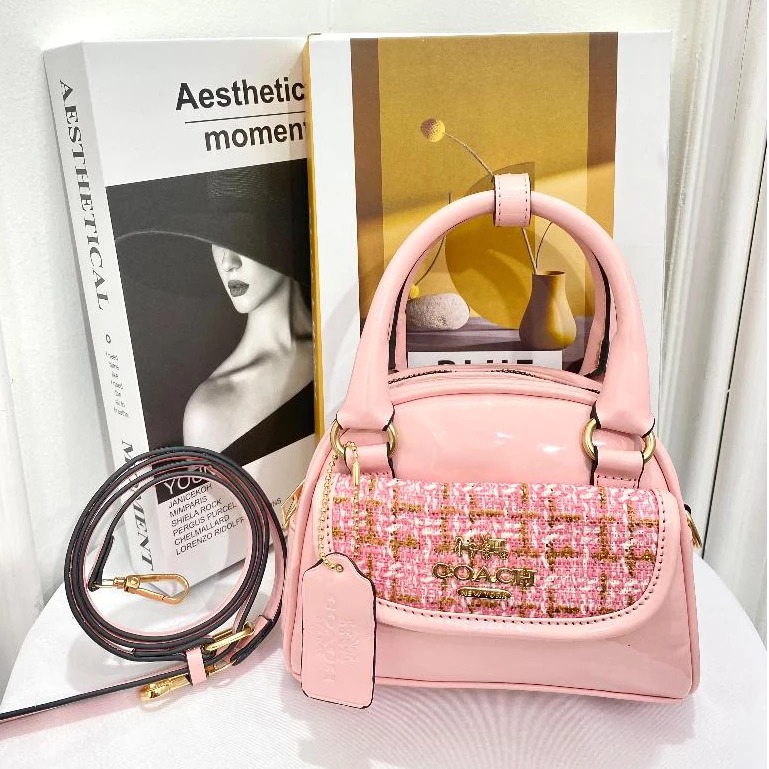 TAS SELEMPANG WANITA COACH HALLI TWEED HAND BAG PINK FULL SET + FREE COVER BAGS