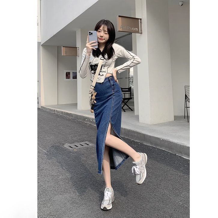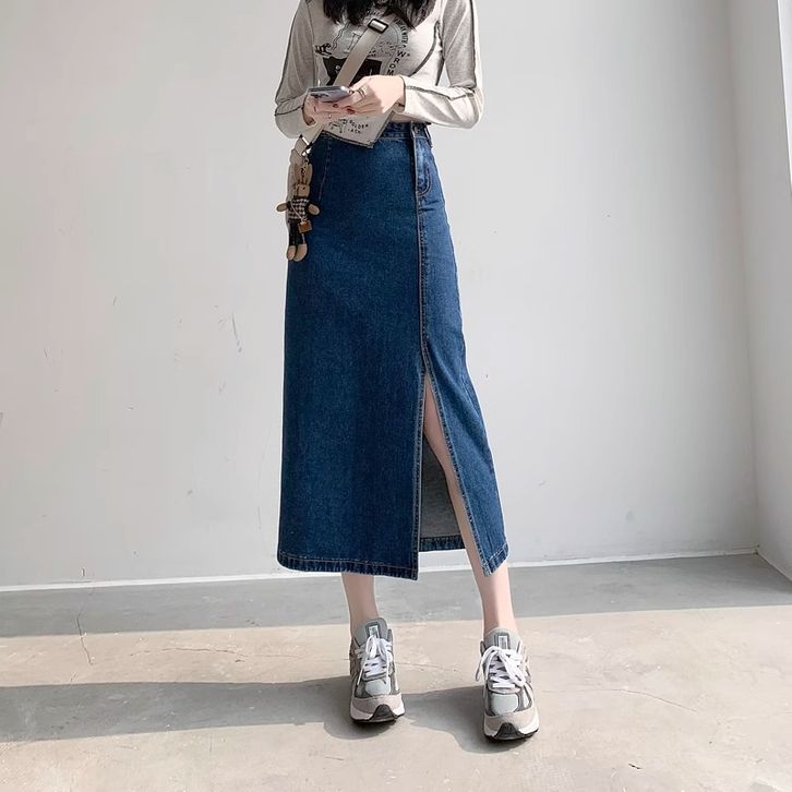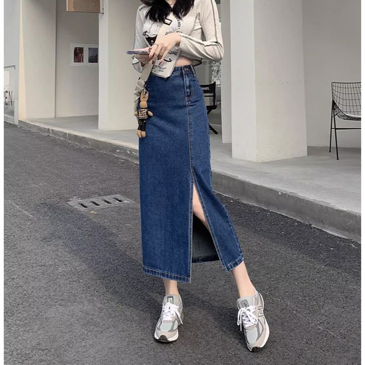Rok Denim Split Style ala Korea A Line Wanita Berpinggang Tinggi Sedang Untuk Menutupi Pinggul Selangkangan