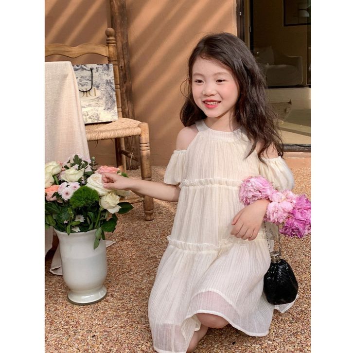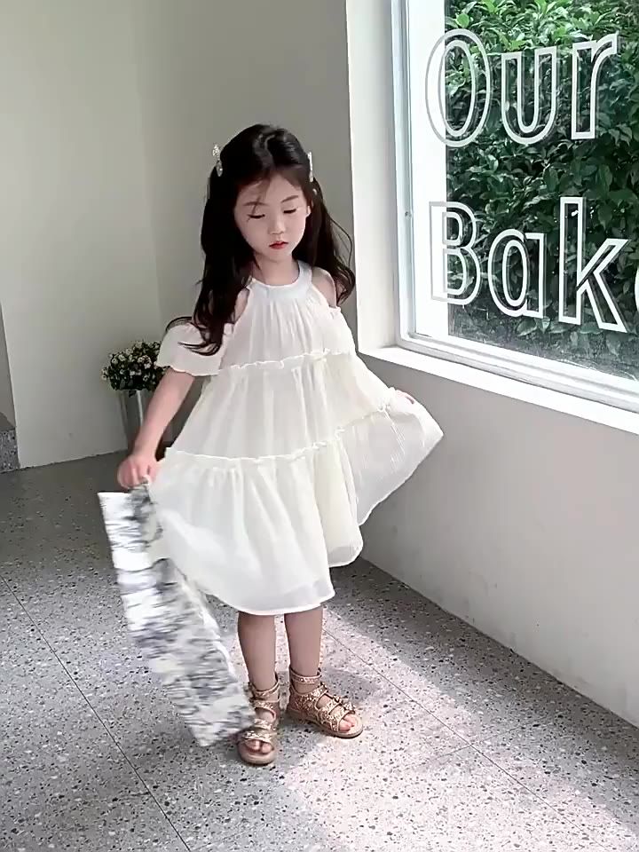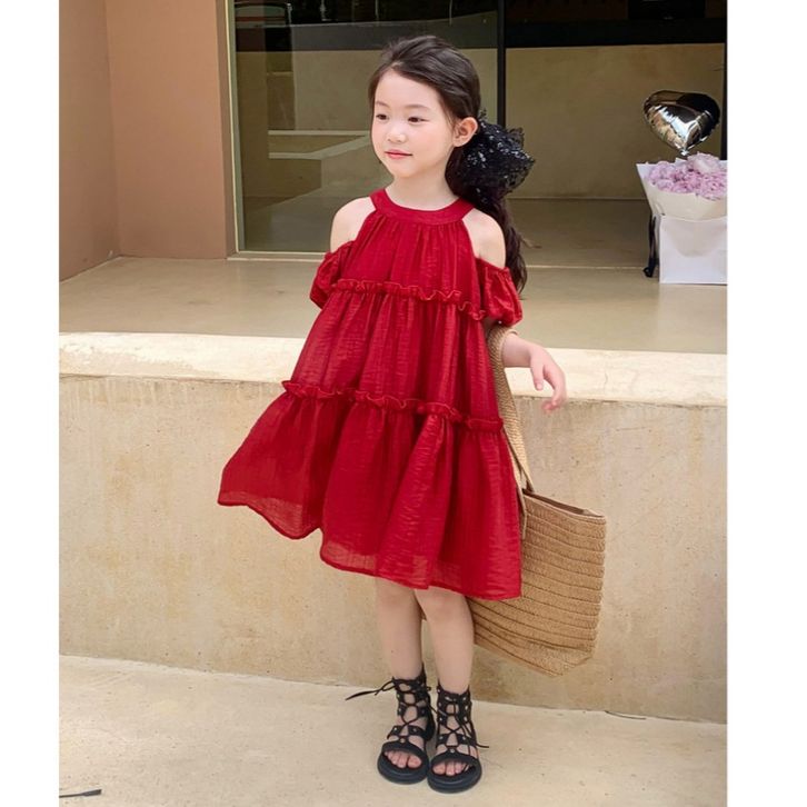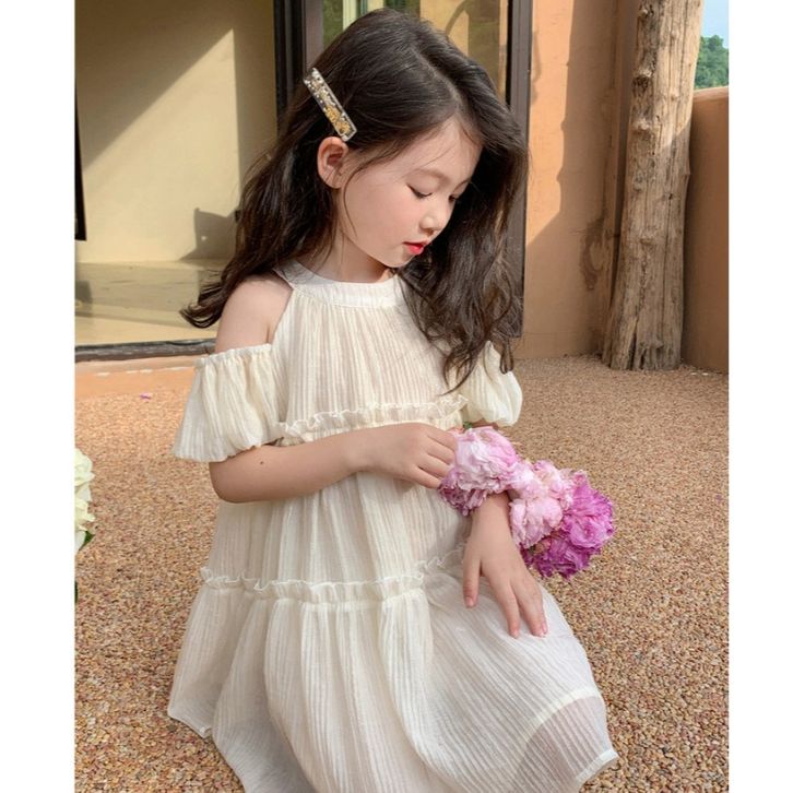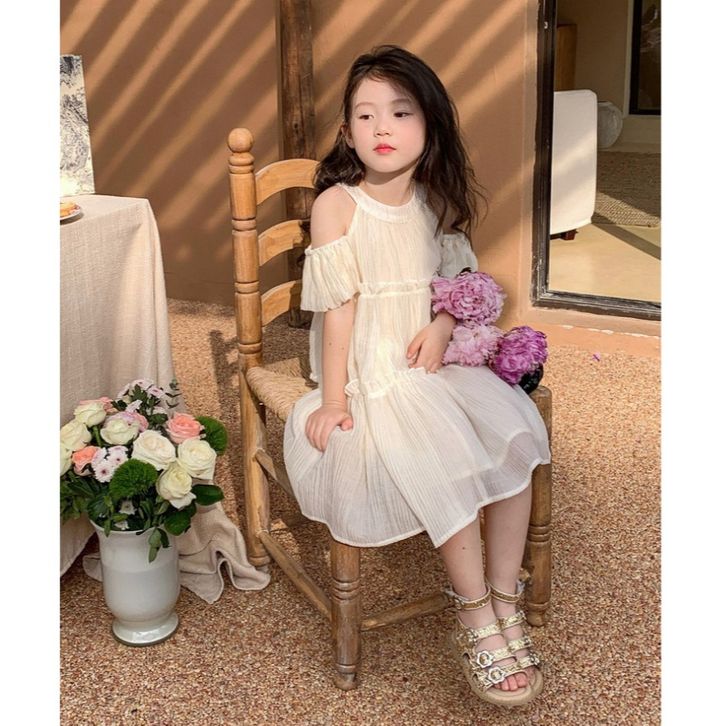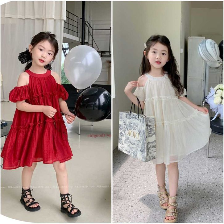 Dress Gaun Anak Perempuan Korea Ruffle Sabrina Cut Sleeve DR30