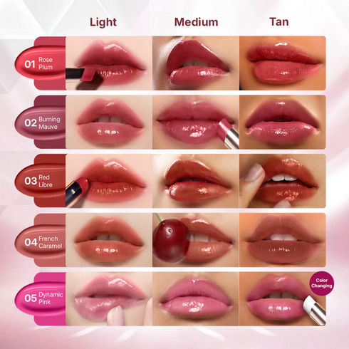 01 Rose Plum, 02 Burning Mauve, 03 Red Libre, 04 French Caramel, 05 Dinamic Pink