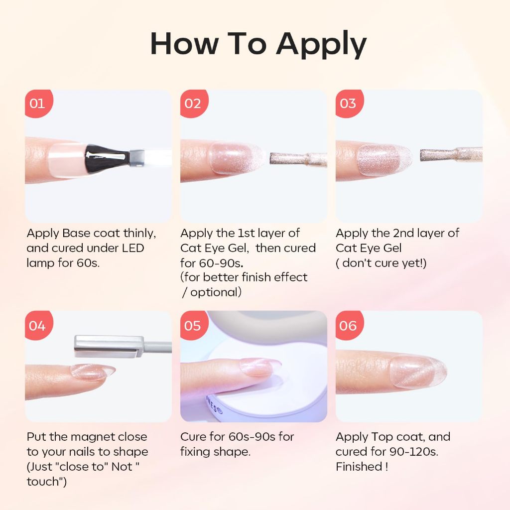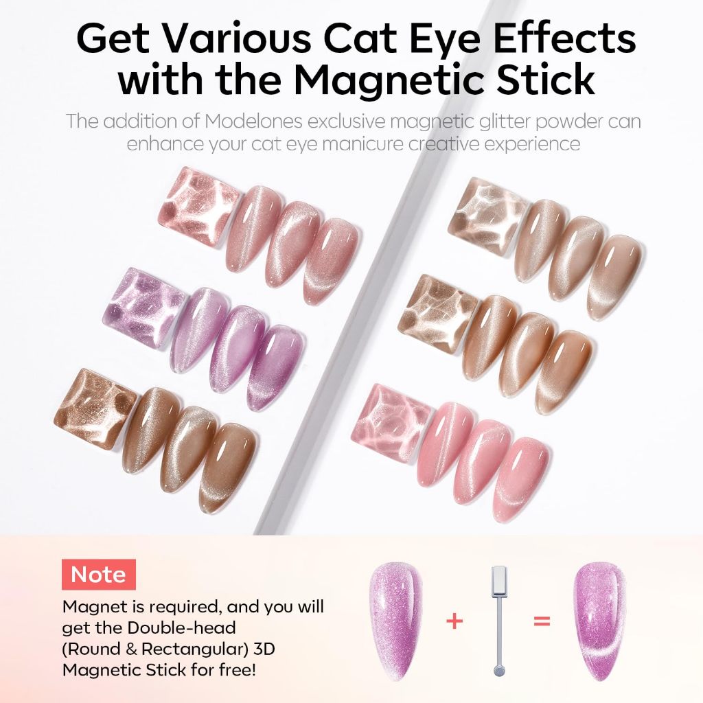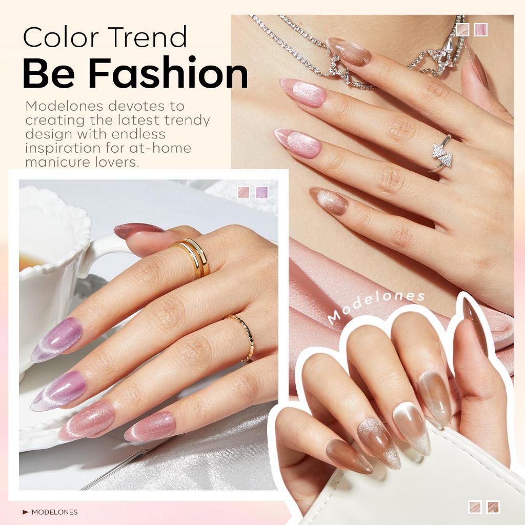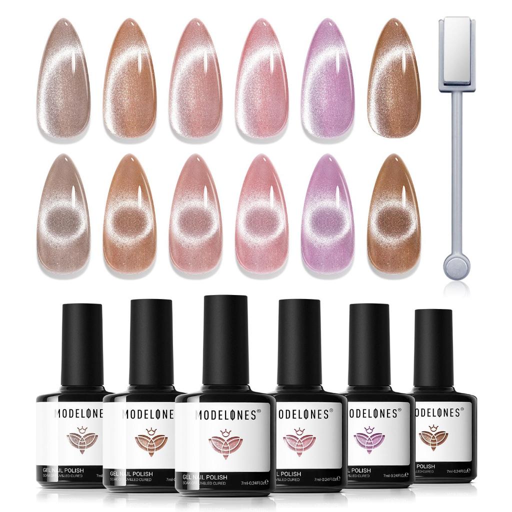 MODELONES CAT EYE GEL NAIL SET POLISH, 6 WARNA HOLOGRAFIK 9D CAT EYE GLITTER GEL POLISH SEMI-TRANSPARENT NUDE PINK BROWN
