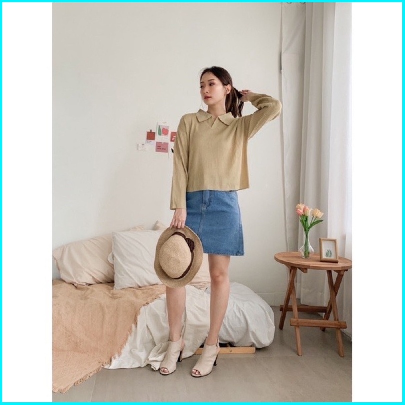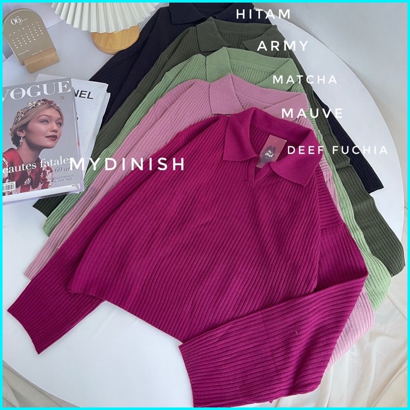 Collar Crop Polo Knit Crop Atasan Rajut Wanita Berkerah Polo