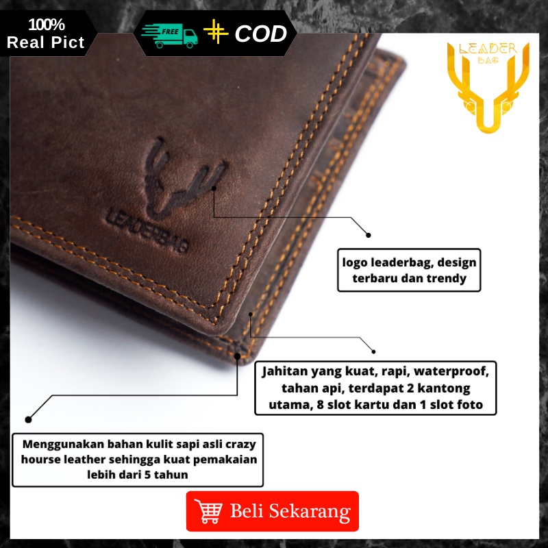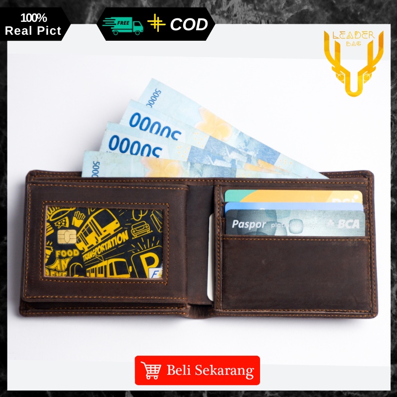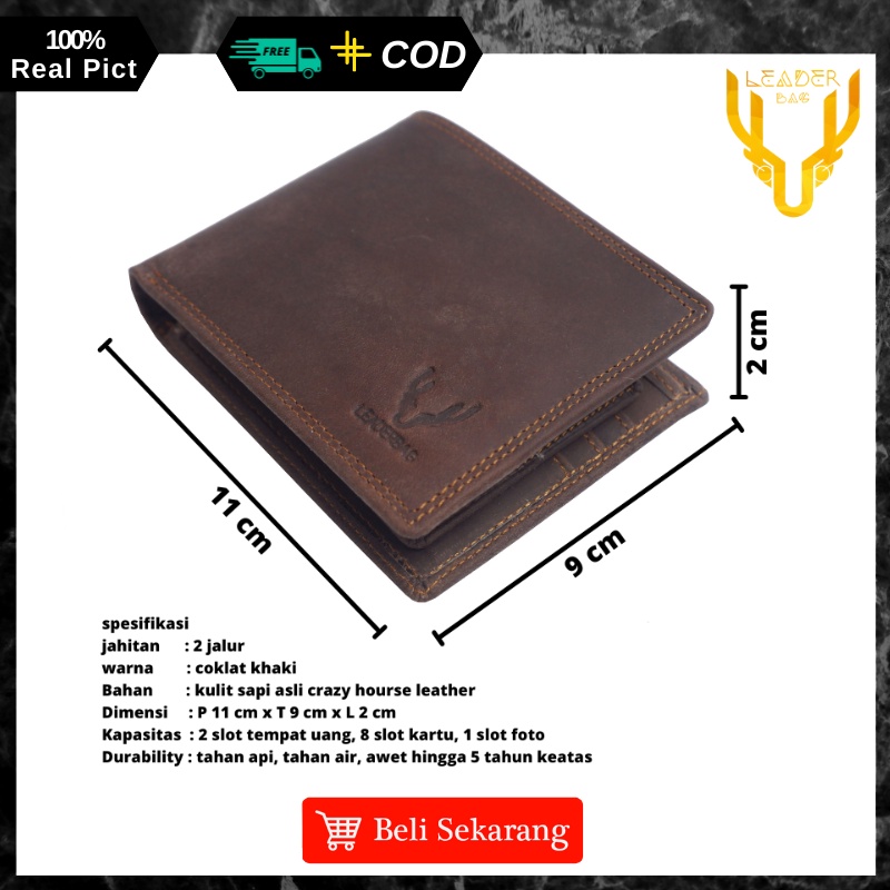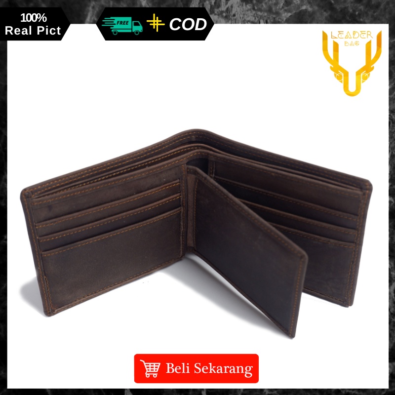 leaderbag Dompet Pria Kulit Sapi Asli Warna Coklat Khaki Terbaru Dompet Lipat Cowok Keren Branded Original Bahan Crazy H