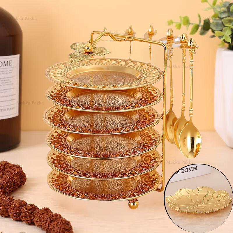 Piring Set Dengan Dudukan / Piring Dessert Hias Saji Emas / Unik Hiasan Meja Rak Mewah Gold / Emas Dessert Permen Kurma