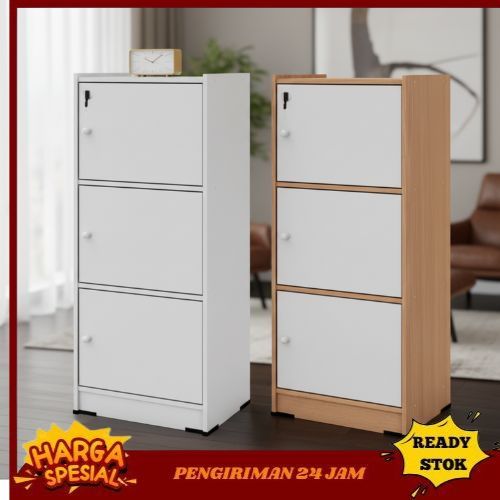 RAK SERBAGAGUNA 3 SUSUN KAYU DENGAN PINTU DAN KUNCI RAK TERMURAH