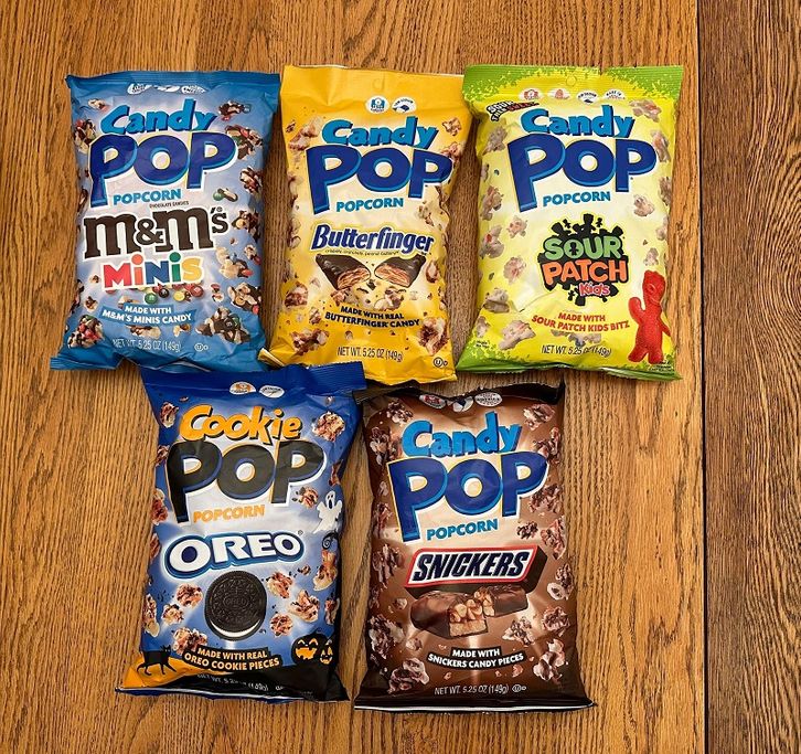 Popcorn Candy Pop Butterfingers Oreo Grape Strawberry Snickers Dare All Dressed Salt Zesty Ranch Cauliflower Pretzels