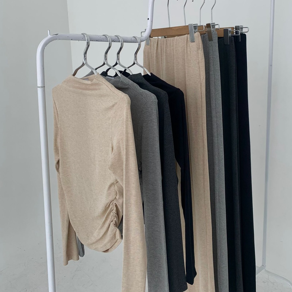 Setelan Wanita Ribbed Knit Set Lengan Panjang Celana Panjang Straight Highwaist Highwaisted Pants