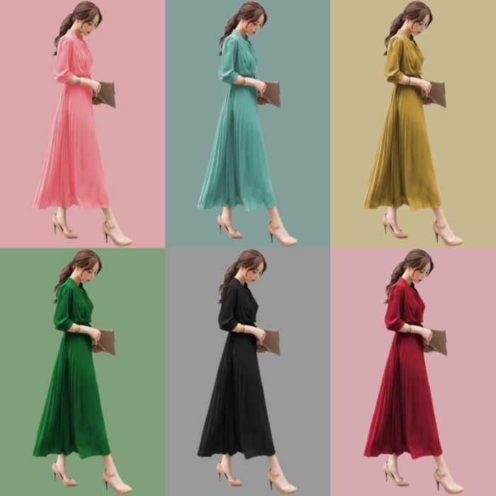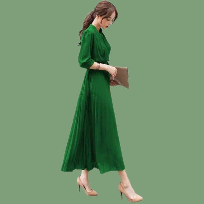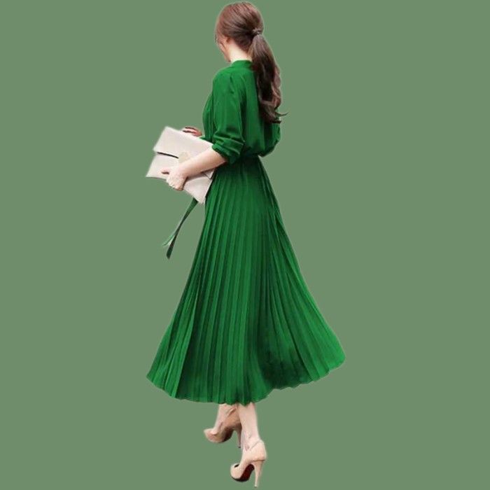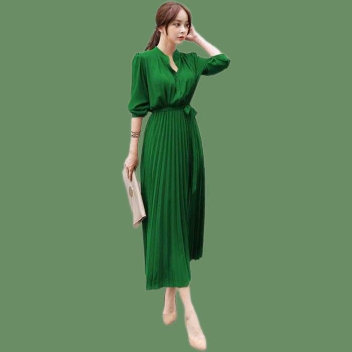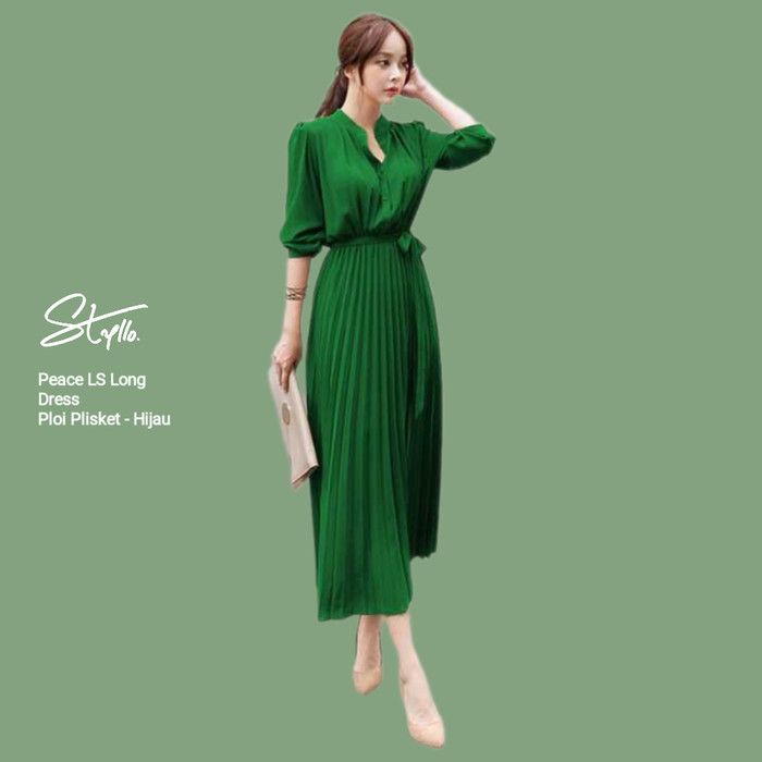 Long Dress Long Dress Lengan Panjang Motif Kancing Rok Ploi Plisket Korea - Hijau - Hijau Muda all size